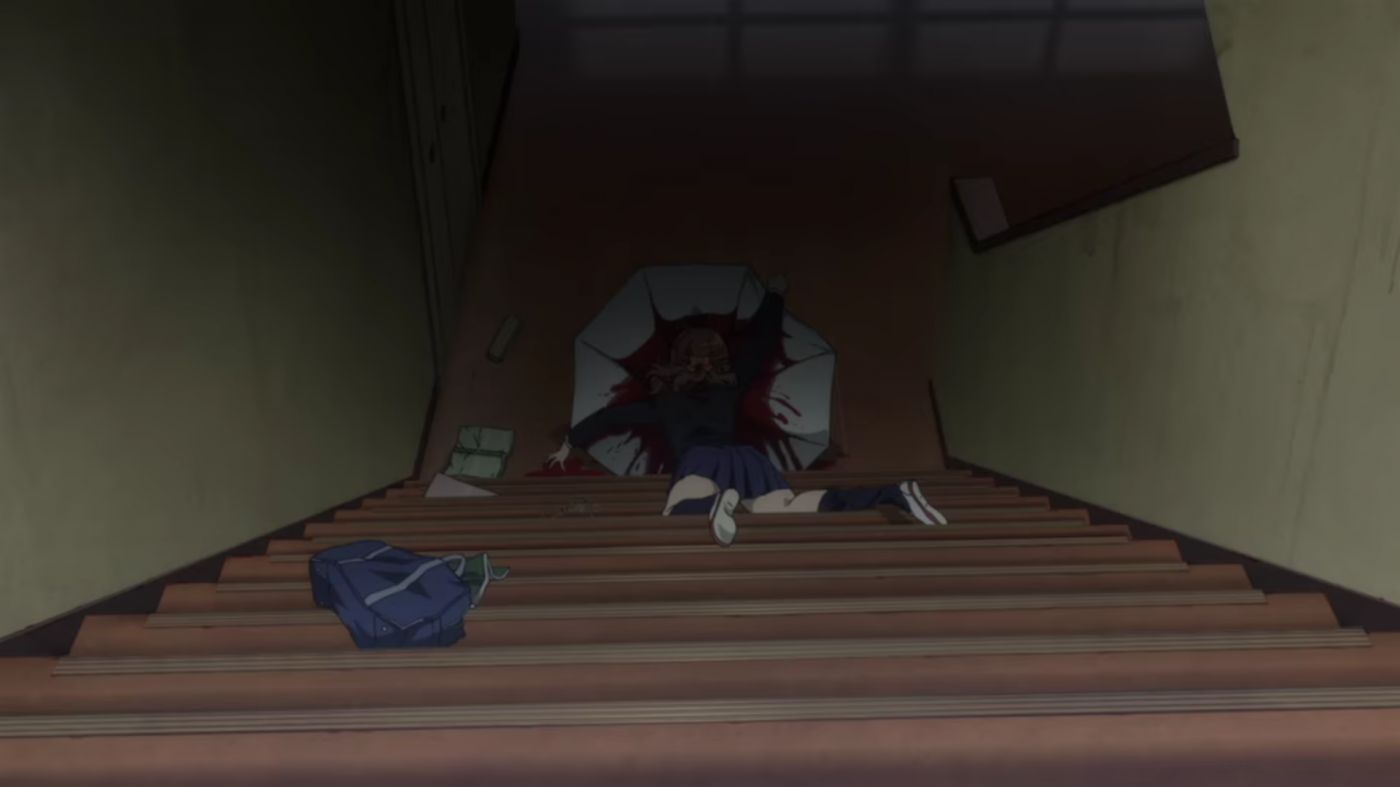 ฉากการตายของเรื่องนี้ก็ทำออกมาสยองถึงจะเป็นอนิเมะก็หลอนอยู่ดี เช่นฉากที่หัวหน้าห้องตกบันไดแล้วโดนปลายร่มของตัวเองปักคอตาย ทำเอาเราเสียวไปเลย