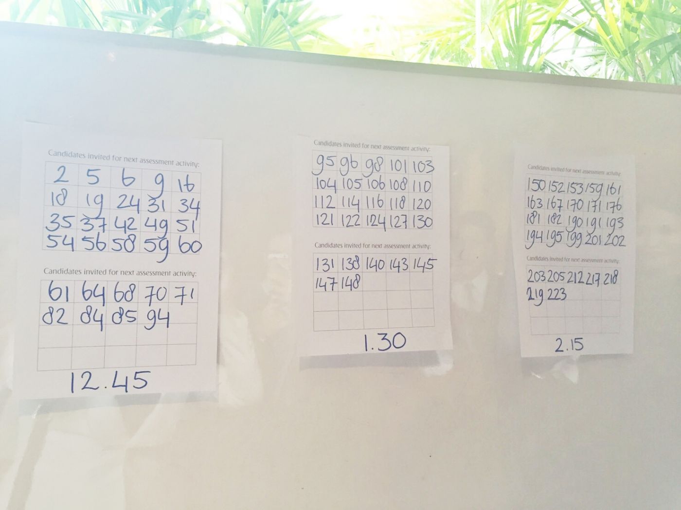 หลังจากรอเกือบทั้งวันประมาณบ่ายแก่ๆกรรมการจะมาติดหมายเลขคนที่ผ่านให้ทราบค่ะ รอบนี้จากเกือบ 1000คน ตัดเหลือแค่ประมาณ 200 คนเพื่อไปทำ Assessment ต่อในวันถัดไปจ้า