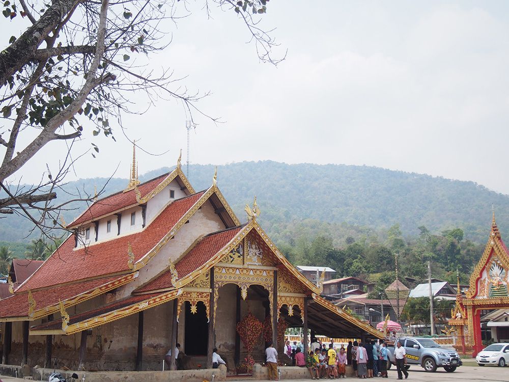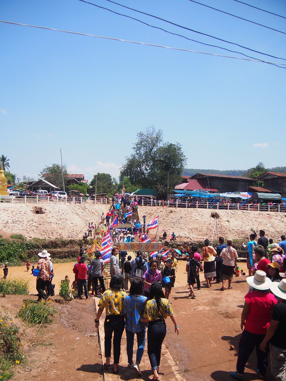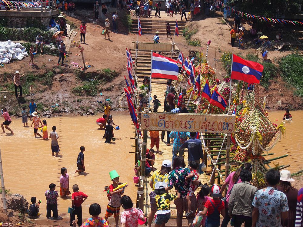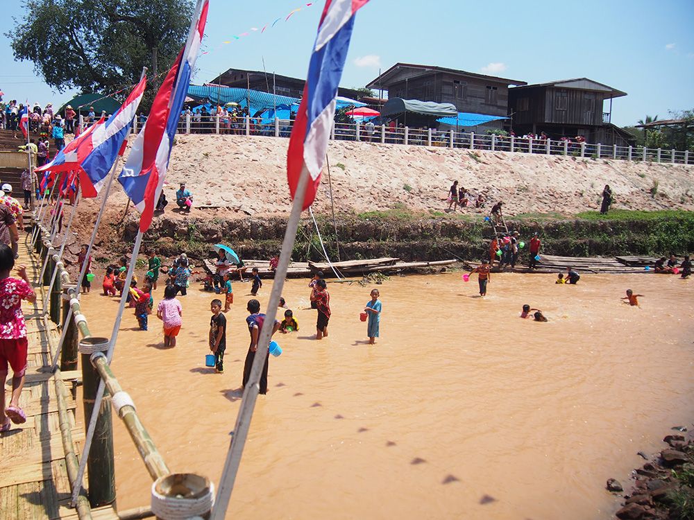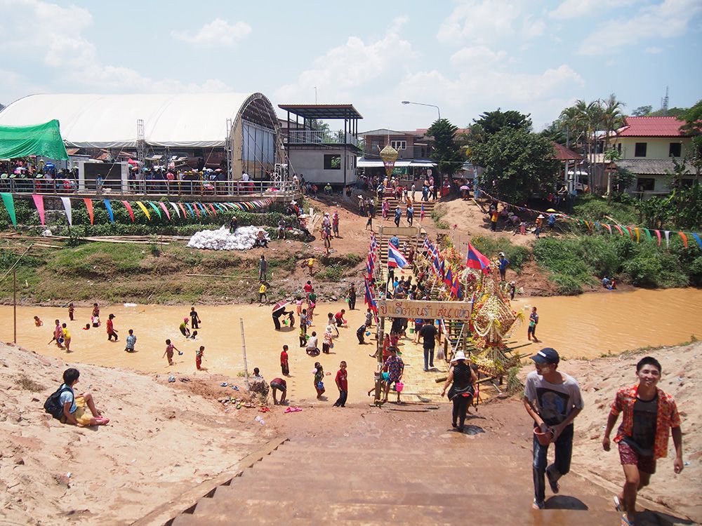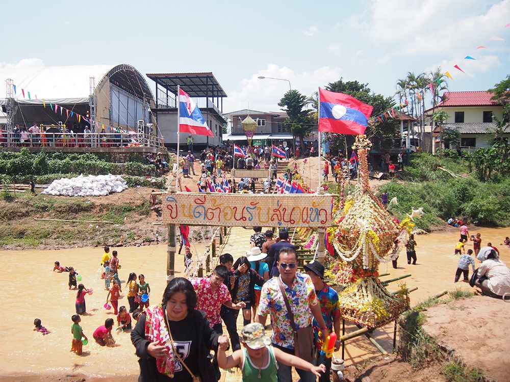 ช่วงวันสงกรานต์ทางด่านไทยและลาวอนุญาตให้เราเดินข้ามสะพานไม้ไผ่ไปอีกฝั่งได้โดยไม่ต้องใช้เอกสารอะไร ข้ามไปก็จะเจอวัดลาวที่เก่าแก่มากและถูกอนุรักษ์ไว้อย่างดี เดินๆเลยวัดไปอีกหน่อยก็เป็นหมู่บ้าน