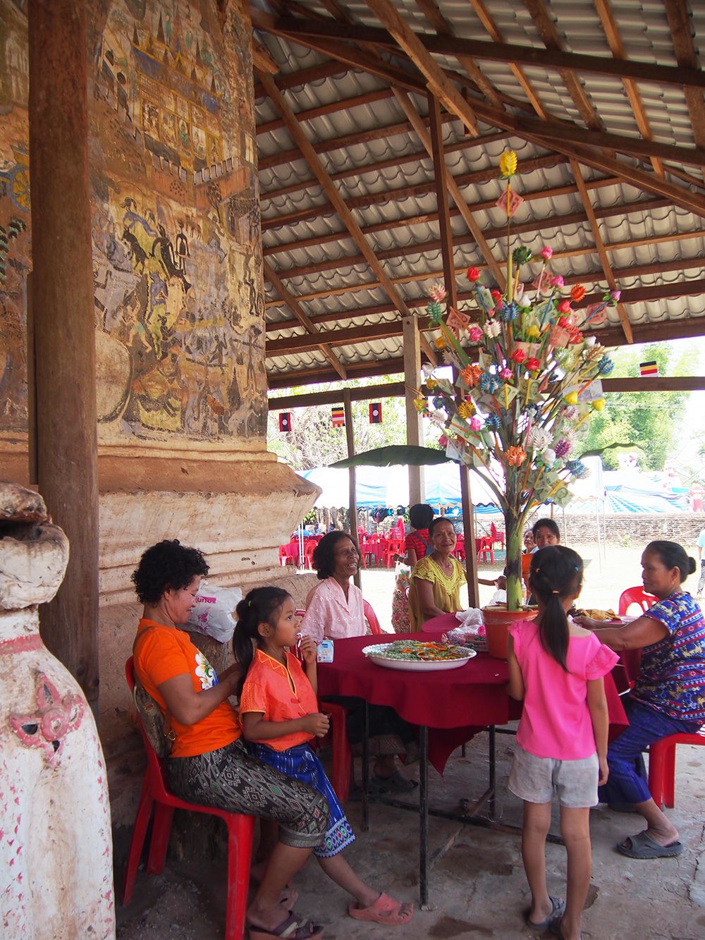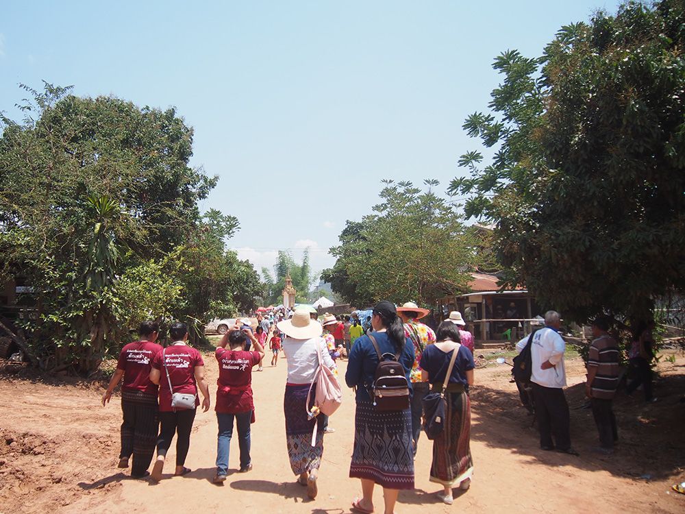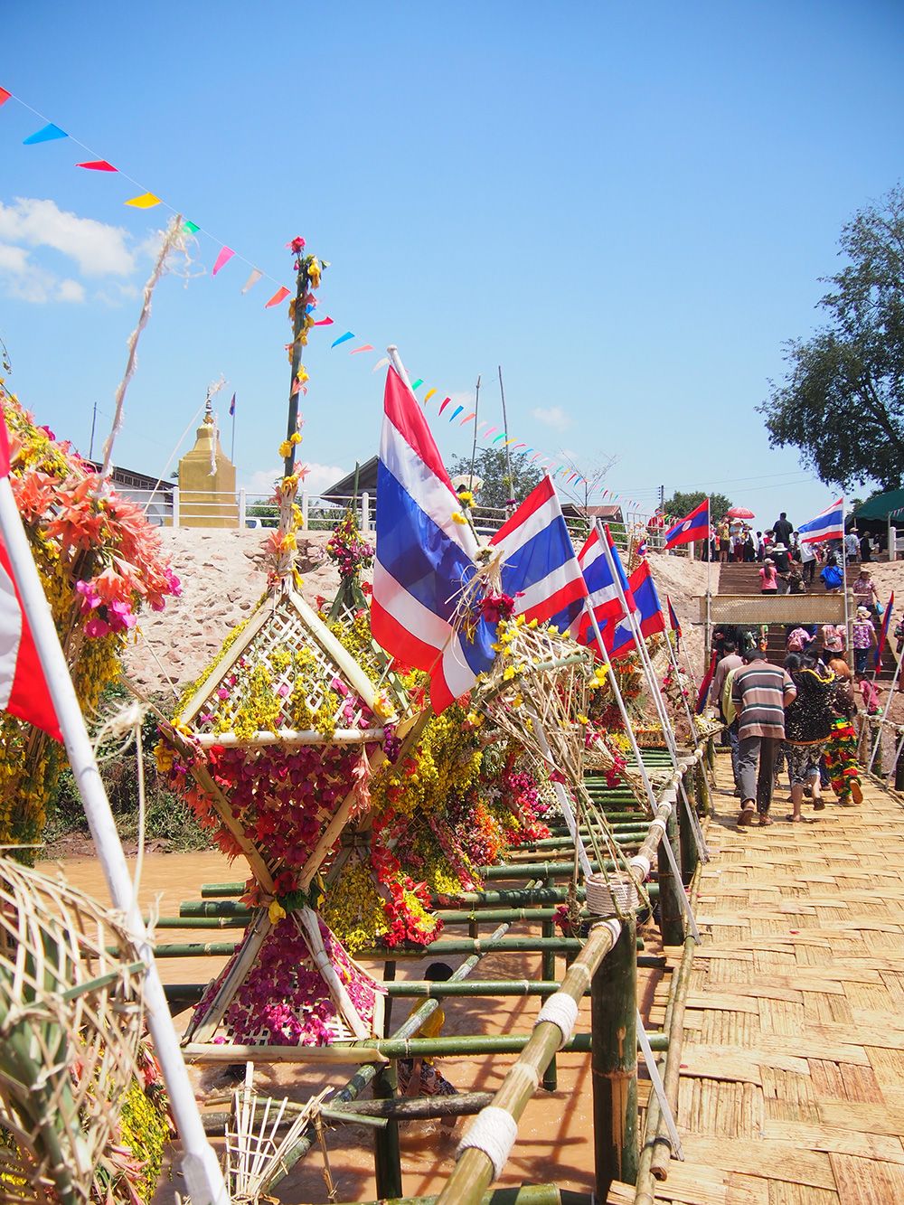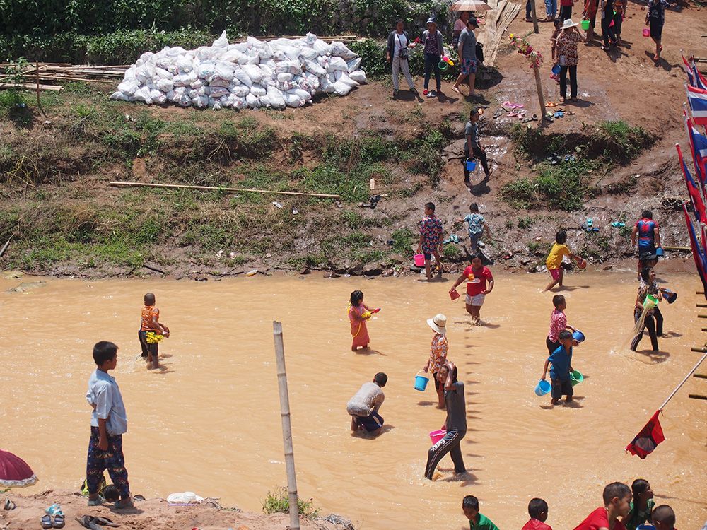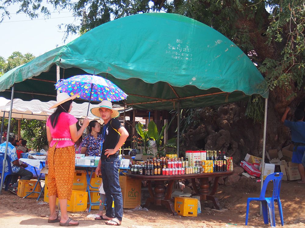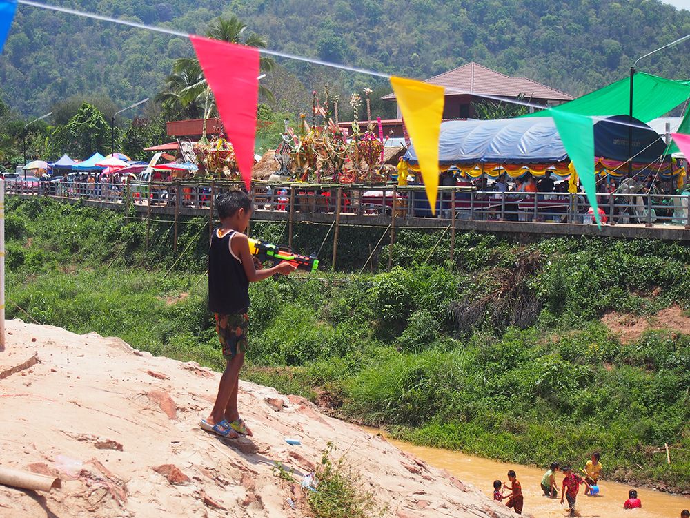ช่วงวันสงกรานต์ทางด่านไทยและลาวอนุญาตให้เราเดินข้ามสะพานไม้ไผ่ไปอีกฝั่งได้โดยไม่ต้องใช้เอกสารอะไร ข้ามไปก็จะเจอวัดลาวที่เก่าแก่มากและถูกอนุรักษ์ไว้อย่างดี เดินๆเลยวัดไปอีกหน่อยก็เป็นหมู่บ้าน