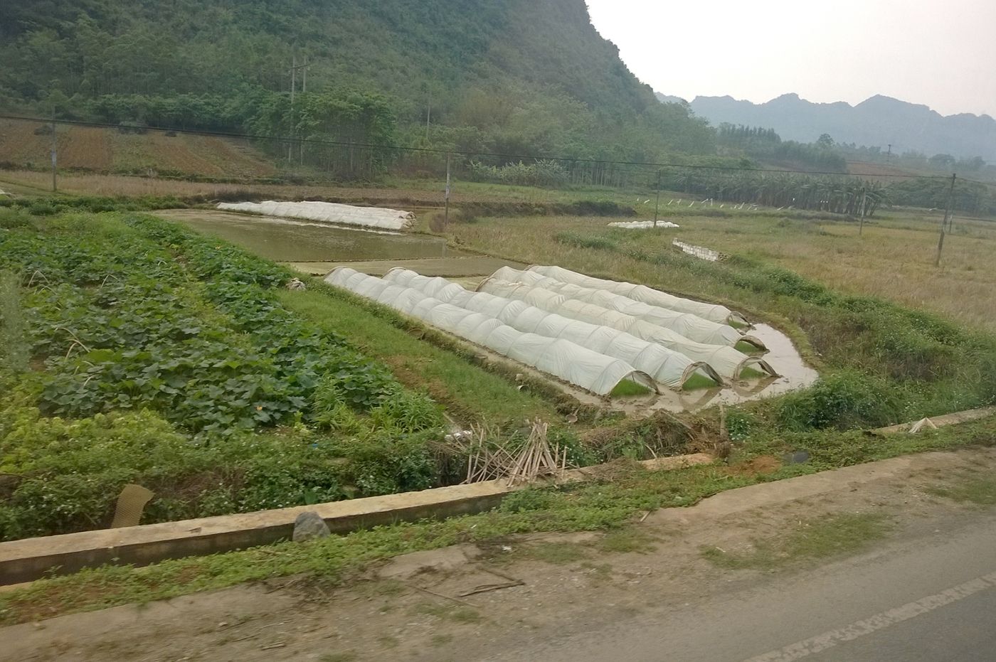 ที่เห็นเป็นโดมพลาสติกคลุมเป็นแถวเดาว่าข้างในน่าจะเป็นต้นกล้าข้าว
