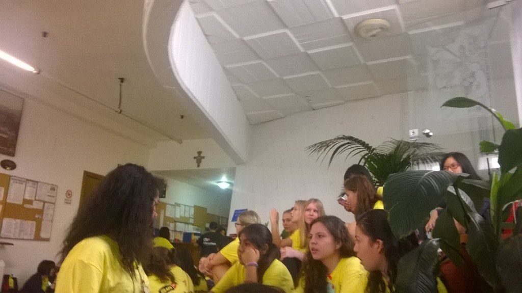 รอกันแบบเหี่ยวๆไป บังเอิญเจอนักเรียนแลกเปลี่ยนจากโดมินิกัน ชื่อจูเลียตอยู่เขตเดียวกันกับเรา ป้ายสีเดียวกัน กรี๊ดดดดด มีเพื่อนแล้ว เลยชวนคุยนิดหน่อย แต่ยังเหลืออีก 2 คนที่ยังไม่เจอ ก็ถามไปว่าเจอสองคนนั้นบ้างไหมนางก็บอกไม่ เพิ่งเจอเราคนแรก แล้วก็บอกเราว่าเออนี่แกชั้นต้องไปห้องน้ำละนะ บายแล้วเจอกันใหม่