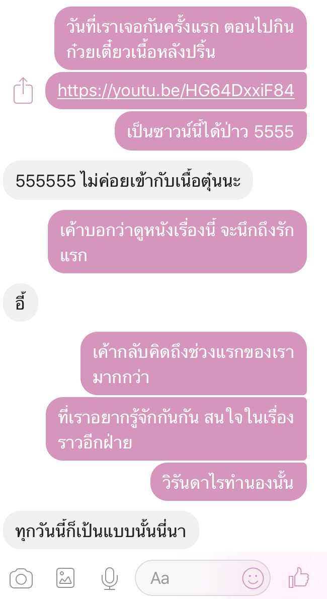 3.ความรู้สึกที่เกิดขึ้นกับเราเลยนะ คือเราไม่นึกถึงรักครั้งแรก เรานึกถึงช่วงแรกของแฟนคนปัจจุบันมากกว่า ช่วงแรกของการคบกันมันแบบเป็นอะไรที่ประหม่ามากๆๆ เหมือนจะมั่นใจแต่ไม่มั่นใจ อยากรู้ความคิดของอีกฝ่ายซะเหลือเกิน ตอนไปกินข้าวกันครั้งแรก เราว่าตอนนั้น sound ในหัวเราเป็นเสียงเปียโนจังหวะเร็วหน่อยเหมือนหัวใจที่เต้นแรง แล้วตอนที่ต่างฝ่ายต่างยอมรับว่าหลงใหลกัน แล้วเราถามว่าทำไมไม่บอกให้เร็วกว่านี้ เราทำแบบนี้ไปทำไมไม่รู้ตัวว่าเราชอบ เค้าก็เฉลยนั้นนี่ มันแบบเป็นช่วงเวลาตื่นเต้นของความสัมพันธ์ เราต่างอยากรู้จักอีกฝ่าย กระตือรือร้นต่อเรื่องที่เค้าชอบ ความรู้สึกซาบซึ้งใจก็ผุดขึ้นมา