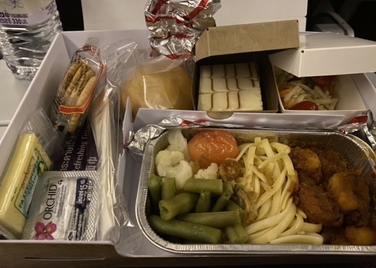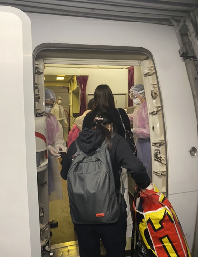 พอขึ้นเครื่อง การบินไทยจะพยายามจัดที่นั่งเป็นที่เว้นที่ ยกเว้นแต่คนที่มาด้วยกันที่เหมือนจะนั่งติดกันได้ แถมคุณแอร์ยังใส่ชุดPPEทับUniformด้วยล่ะ (ไม่ถึงขั้นปิดหน้าปิดตาแบบที่เห็นกันเกลื่อนกล่าน เป็นแค่ผ้ากระดาษโปร่งๆคลุมไว้เฉยๆ)
