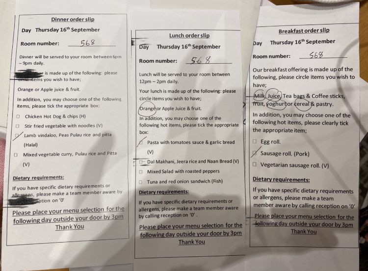 ในหนึ่งวันเราสามารถขอทางโรงแรมออกไปเดินเล่นได้20นาทีโดยจะมีคนคอยตามประกบอยู่ ส่วนอาหารเขาจะให้ใบเลือกเมนูมาตั้งแต่แรกเลยเพื่อกรอกเมนูในแต่ละมื้อใน10วันนี้ โดยที่เราจะต้องนำใบที่เราเลือกเมนูเสร็จของวันถัดไปไปวางไว้หน้าประตูห้องก่อน3PM พอถึงเวลาอาหารพนักงานก็จะมาเคาะ+กดกริ่งหน้าประตู เราก็ออกไปเอาถุงอาหารได้