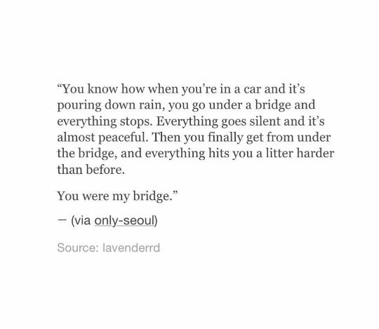 “ลองจินตนาการดูก็ได้ เอาแบบตกหนักๆ เลยนะ เสียงฝนมันอื้ออึงจนแทบจะไม่ได้ยินอะไร ทั้งหนวกหูและน่ารำคาญไปหมด” ชายหนุ่มเหลือบไปมองหญิงสาวที่ตอนนี้หลับตาวาดภาพตาม “เราไม่ได้ยินเสียงอะไรนอกจากน้ำฝนที่กระทบบนหลังคารถราวกับว่ามันกำลังประท้วงถึงความเสียใจที่ต้องแบกรับมาหลายเดือน นั่นแหละ มันเป็นแบบนั้นจนกระทั่งผมขับผ่านสะพาน และชั่ววินาทีนึงที่ผมอยู่ใต้สะพานทุกอย่างมันเงียบสงบ ผมรู้สึกปลอดภัย เหมือนโดนตัดขาดจากโลกไปชั่วขณะ นั่นน่ะคือความรู้สึกที่ผมมีต่อคุณตอนที่เราคบกัน คุณคือสะพานของผม”