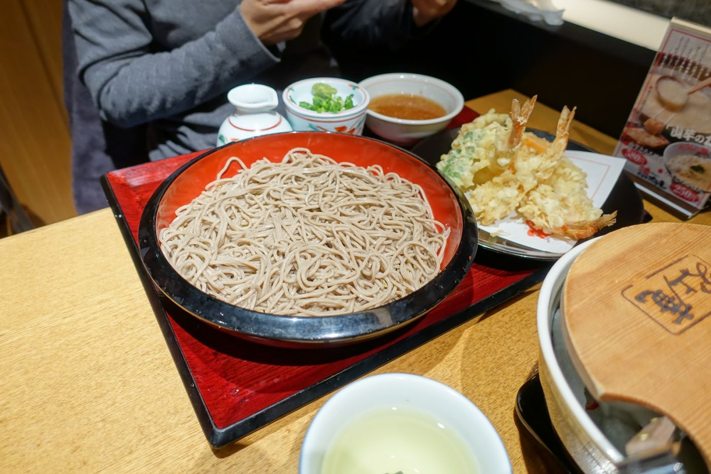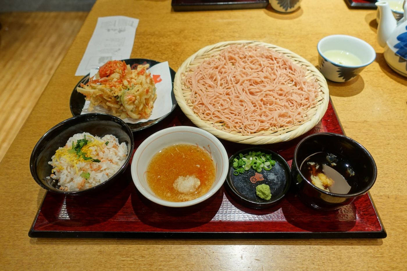 มื้อเย็นวันนั้นเราตัดสินใจเลือกร้านโซบะ เพราะหิว แต่ก็ไม่อยากกินอะไรหนัก ๆ และยังถูกดึงดูดด้วยป้ายซากุระโซบะหน้าร้าน จริง ๆ รสชาติก็ไม่ต่างจากปกติเท่าไหร่หรอก แค่มันสีสวยกว่าปกติเพราะทำเป็นสีชมพู ด้วยความหิวเราก็ฟาดเรียบ