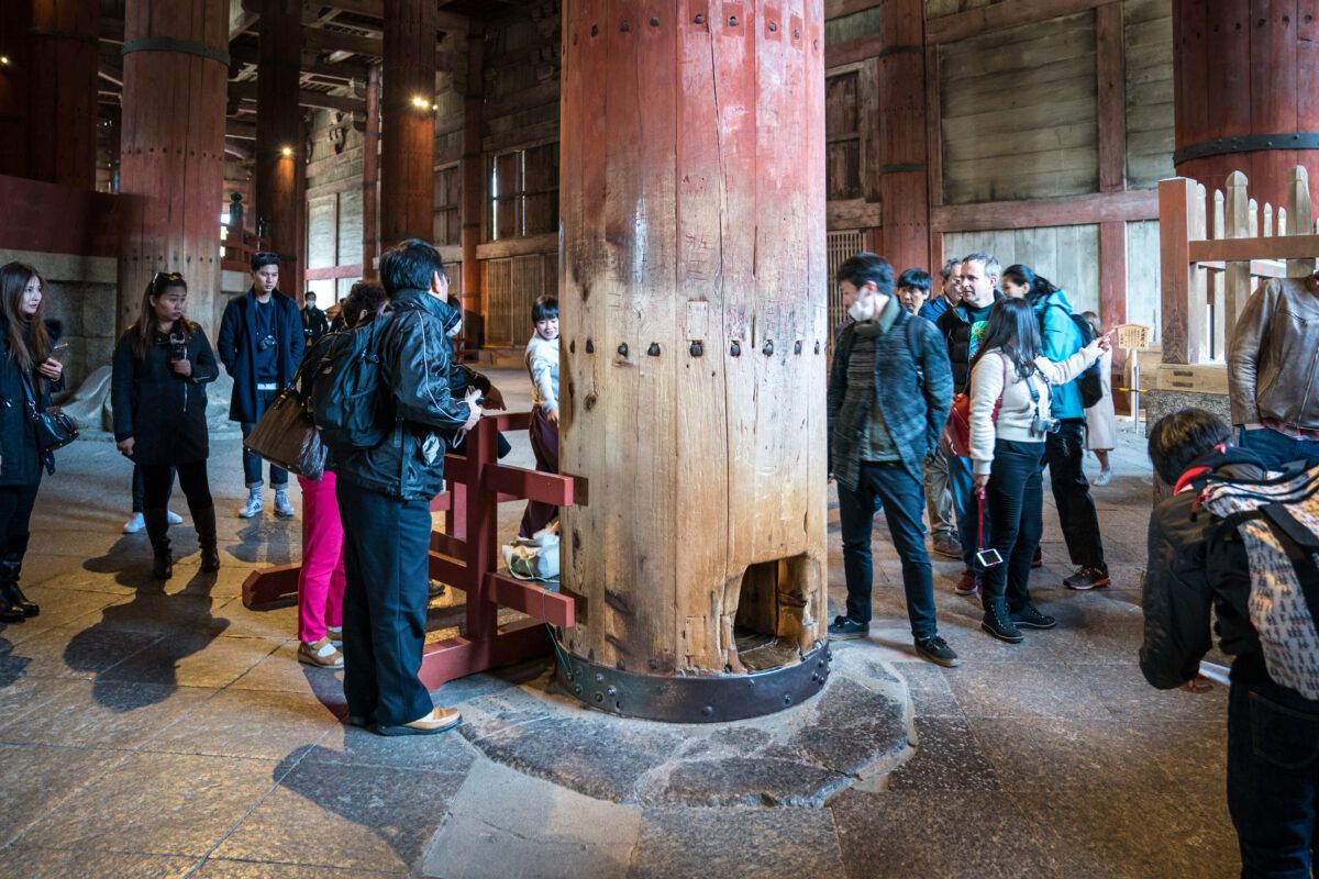 แน่นอนว่าสิ่งที่น่าสนใจคงจะไม่ได้มีแค่ไดบุทสึ เพราะเสาเคลือบสีชาดขนาดใหญ่ที่มีรูโบ๋ตรงฐานเสานั้น คงทำให้เราสะดุดตาได้ไม่ยากเลยใช่ไหมล่ะ? ว่ากันว่าถ้าใครสามารถลอดรูที่ปรากฎบนเสาดังกล่าวได้ ก็จะสามารถตรัสรู้เป็นผู้รู้ ผู้ตื่น ผู้เบิกบานได้ในชาติหน้า! [13] แต่ขอเตือนไว้ก่อนว่ารูมันเล็กอยู่นะ เด็กน้อยและคนตัวเล็กอาจจะลอดได้สบาย แต่ถ้าเป็นคนตัวใหญ่อาจจะต้องพยายามหน่อยเน้อ