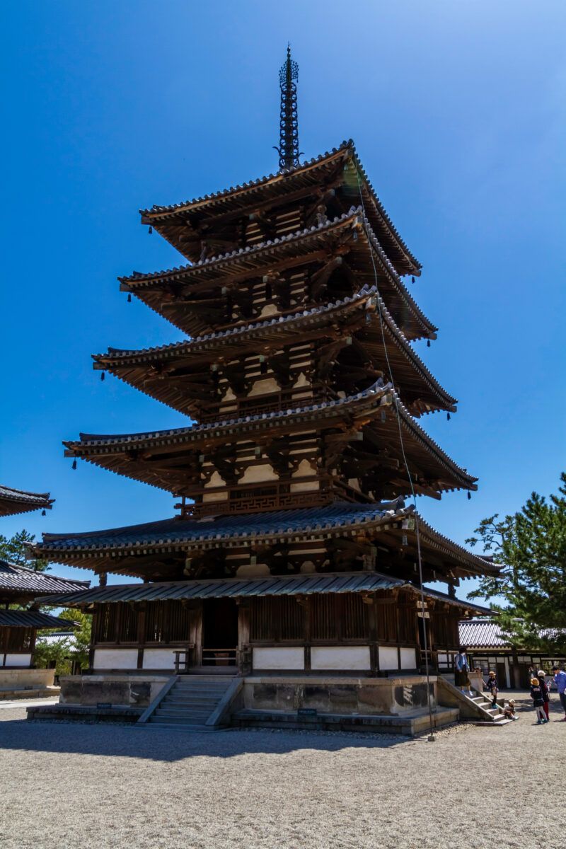 อย่างเขตตะวันตกของวัดก็จะมีเจดีย์ 5 ชั้นที่เชื่อกันว่าสร้างมาตั้งแต่ยุคอาสึกะ หรือประมาณช่วงกลางศตวรรษที่ 6 ถึงต้นศตวรรษที่ 8 แถมยังเป็นสิ่งก่อสร้างแห่งหนึ่งที่ผ่านกาลเวลามาได้โดยรอดพ้นจากทุกภัยพิบัติอีกด้วย! อย่างไรก็ตามสิ่งก่อสร้างที่ว่านี้ก็ผ่านการบูรณะมาแล้วหลายครั้งเช่นกัน เพื่อคงสภาพให้สมบูรณ์ดังที่เห็นในปัจจุบัน