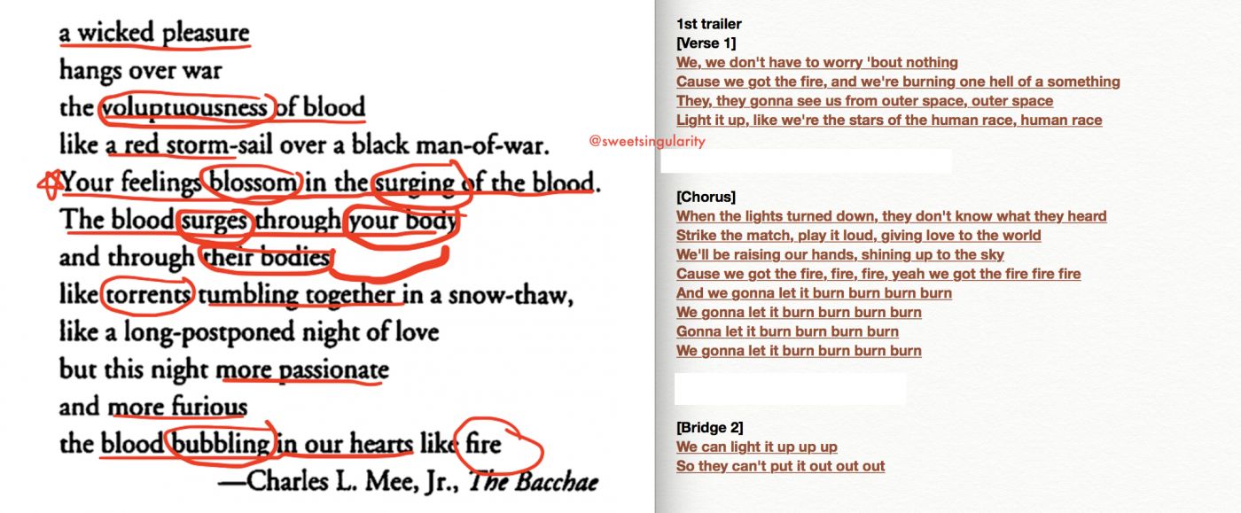 พร้อมๆกับวลี "Torrents" วลีในบรรทัดสุดท้ายของกลอน "Blood bubbling in our hearts like fire" ("เลือดเดือดเป็นฟองฟุ้งในหัวใจดังไฟ") เพิ่มเติมคำอธิบายของกระแสเลือดว่าเดือดดังไฟ เป็นหมัดหนักสุดท้ายของกลอนที่ทำให้เรานึกถึงเพลง Burn ได้ไอเดียวิเคราะห์เปรียบเทียบกลอนกับเพลงเลย แถมการสัมผัสอักษร 'b' อ่านออกเสียงจะได้ยินเสียง 'buh buh' เหมือนฟองน้ำสีแดง กำลังเดือดบนพื้นผิวหัวใจ ความเดือดที่ไม่สามารถควบคุมได้เหมือนไฟป่าที่ลุกลามอย่างรวดเร็ว ซึ่งพ้องกับสองบรรทัดท่อน Bridge ที่สองของเพลง ("We can light it up up up/So they can't put it out out out"; "เราจะจุดมันให้ลุกโชน จนไม่มีใครสามารถดับมันได้") ในหนังตัวอย่างนั้น ใช้ประกอบฉากท้ายๆปิดคลิปพอดี เสียงเด็กสาวคนร้องค่อยๆแผ่วลงตามคลิปที่จบ คล้ายอารมณ์เยือกเย็น เปล่าเปลี่ยว ใกล้ตายของหนัง ซึ่งขัดกับประโยคปลุกใจให้ไฟลุกโชน ช่างเป็นที่น่าขนลุกของคนฟัง