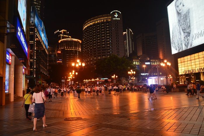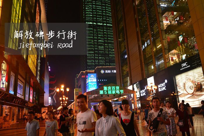 เราชอบที่นี่ตอนกลางคืนเป็นพิเศษค่ะเพราะมันสวย ด้วยแสงไฟจากห้างร้านต่างๆ มันดูสวยจริงๆ ส่วนมาคนจีนและชาวต่างชาติเองจะมาถ่ายรูปที่Time Square กันตลอดๆทั้งเช้าจนค่ำ แถว Jiefangbei จะมีถนนที่เรียกว่า 好吃街 เป็นถนนสายสั้นๆมีของกินขายตามข้างทางค่ะ แต่เรายังไม่เคยไปลองที่นั่นเลย