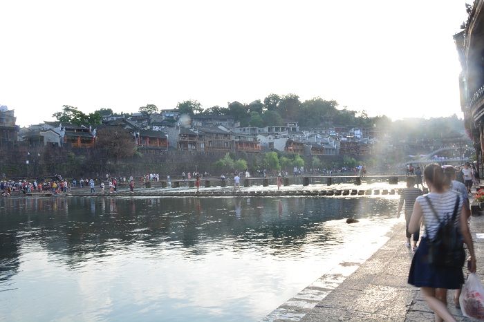 เมื่อถึงเฟิ่งหวงแล้วเราต้องนั่งรถเข้าไปอีก ที่จริงจะเหมาแท็กซี่เข้าไปก็ได้แต่เรางงๆ เห็นคนขึ้นรถทัวร์คันนึงไป เราก็ถามไกด์ท้องที่แถวนั้นว่าเราอยากไปเมืองโบราณเฟิ่งหวงต้องขึ้นรถคันไหน เขาก็บอกว่าคันนี้ขึ้นได้เลยเราก็ขึ้น ปรากฏขึ้นไปไกด์ก็ขายทัวร์ตลอดระยะทาง ในใจก็แบบ...เอาแล้วตอนลงจะเสียตังค์มั้ยเนี้ยย จะเกิน10หยวนมั้ยเขาคงไม่ยัดเยียดทัวร์ให้เราใช่มั้ย พอถึงที่หมาย เราก็เห็นมีคนเริ่มๆลงเราก็ลงตาม 55555 กลัวเสียเงินสุด ปรากฏนั่งรถฟรีจย้า จากนั้นเราก็ไปหาโรงแรมที่จองไว้