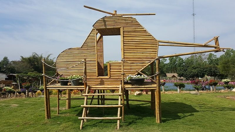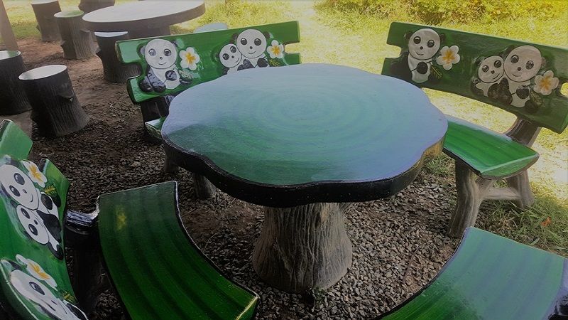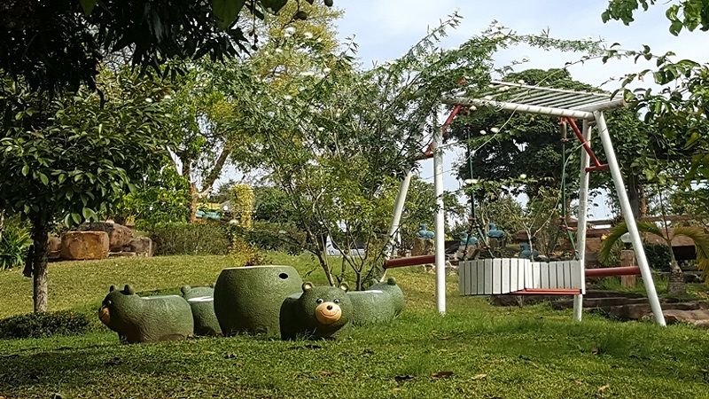 โต๊ะกลม เก้าอี้หมี ก็น่ารักน่าเอ็นดู สีเขียวกลมกลืนกับต้นไม้ใบหญ้า ตัดกับชิงช้าสีขาวสะดุดตา