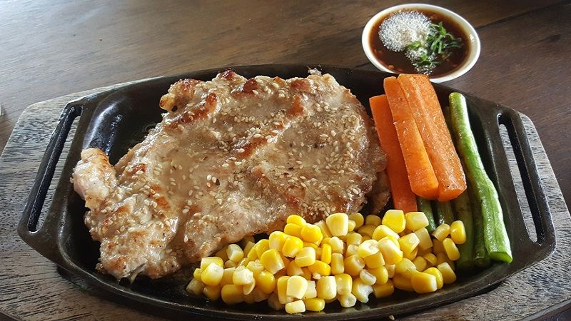 สเต็กหมูชิ้นโต๊ โต เคียงด้วยข้าวโพด แครอท ถั่วฝักยาว เสิร์ฟคู่น้ำจิ้มแจ่ว รอให้มาลองจ้า