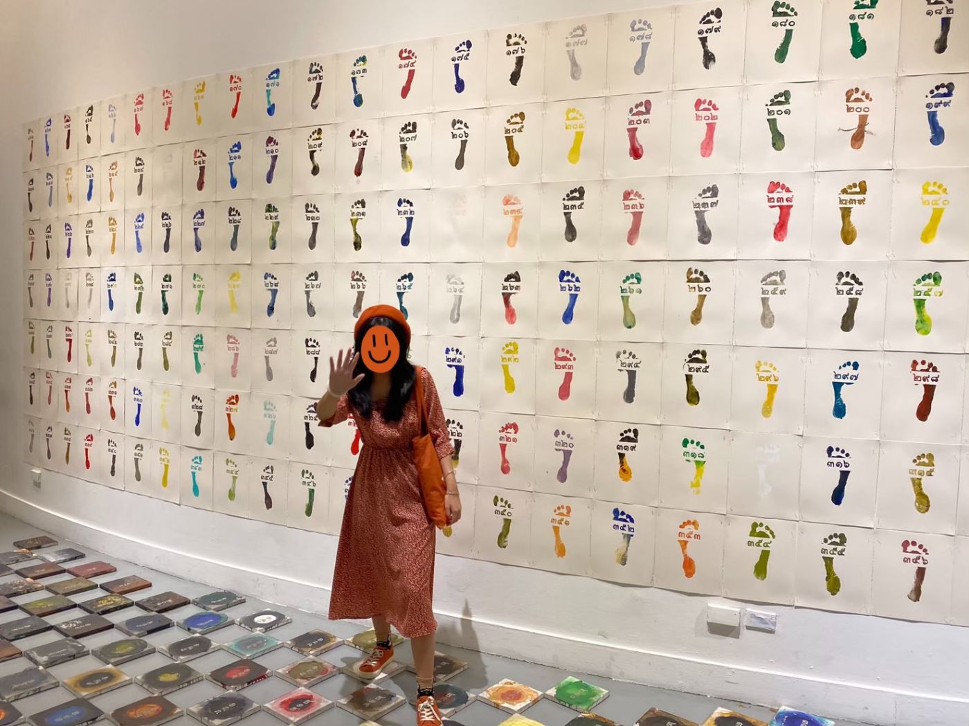 เมื่อมองพื้นที่การแสดงผลงานทั้ง 2 นี้จากระยะไกลด้วยความจดจ่อจะเริ่มลายตา  แต่หากมองจากระยะสายตา จะสังเกตเห็นโทนสีที่ต่างกันของงานภาพพิมพ์รอยเท้าบนกำแพง 2 ด้าน งานบนผนังด้านซ้ายจะมีโทนสีหม่น ๆ เหมือนกัน จึงเกิดความรู้สึกขนลุกเล็กน้อย ประกอบกับภาพฝ่าเท้าและเลขไทยที่อยู่ติดกันในลักษณะซ้ำ ๆ แตกต่างจากงานบนผนังด้านขวาที่มีสีโทนสดใส มองแล้วเพลิดเพลินอารมณ์ เหมือนเห็นเยลลี่หลากสี