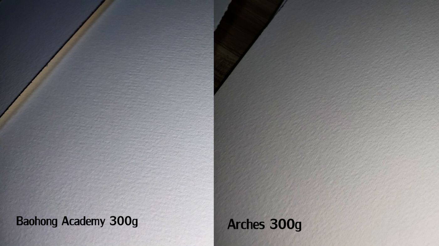 Texture จะขรุขระกว่า Arches เห็นเป็นแพทเทิร์นชัด ส่วนตัวว่าแบบเล่มแพทเทิร์นไม่ค่อยสวย แบบแผ่นลายอาจจะสวยกว่า