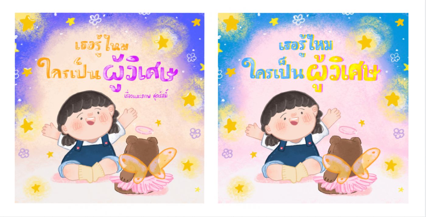 สิ่งที่ทุกคนไม่ว่าจะทำหนังสือภาพหรือวรรรกรรมต้องทำในช่วงนี้คือ ออกแบบและแก้ไขหน้าปกผลงานของตนเอง จากใจฉันที่แก้ปกมาตลอดตั้งแต่เริ่มทำผลงาน พอจะจับทางได้แล้วว่าหากเนื้อหาด้านในยังไม่เรียบร้อยการออกแบบหน้าปกจะไม่ใช่เรื่องง่ายเลยสักนิด เพราะหน้าปกไม่เพียงแต่ต้องสื่อถึงเนื้อหา ยังต้องดึงดูดสายตามากที่สุดอีกด้วย คราวนี้ฉันจึงลองออกแบบปกใหม่เป็นครั้งสุดท้าย ผลออกมาว่ามันน่ารักถูกใจชนิดที่ฉันไม่อยากวาดใหม่แล้ว จึงส่งให้อาจารย์ที่ปรึกษาช่วยดูซึ่งผลตอบรับก็ดีเกินคาด เพราะอาจารย์ก็ชอบเช่นกันติดก็แค่โทนสีเท่านั้น ที่จากเดิมฉันใช้โทนม่วง อาจารย์ก็แนะนำว่าอาจเป็นโทนสีที่ใกล้เคียงกับตัวหนังสือชื่อเรื่องจะยิ่งสวย และเมื่อลองปรับสีแล้วก็ดูน่ารักสดใสมากขึ้นจริง โทนสีของภาพก็ดูหวานละมุนเข้ากับเนื้อเรื่องมากขึ้นอีกด้วย