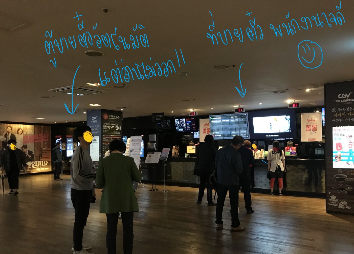 พอถึงวันนี้สอบอะไรเรียบร้อยก็เดินจากมอไปสถานีรถไฟใต้ดินนั่งไปประมาณสามสถานีก็เดินไปห้าง Say two ซึ่งมีส่วนของโรงหนังในชั้น 6และ7 พอถึงชั้นโรงหนังก็เดินงงๆหาที่ซื้อตั๋วอยู่แปปนึงจนเจอเคาเตอร์ขายตั๋วเราผู้ซึ่งภาษาเกาหลีอ่อนแอก็โชว์รูปที่แคปจากในเว็บให้เค้าดูเลยว่าจะดูเรื่องนี้รอบนี้นะ ราคาตั๋วหนังคือ 10,000 วอน ประมาณ เกือบๆสามร้อยบาทไทย(ลืมบอกหนังเป็นเสียงอังกฤษซับเกาหลีนะ)