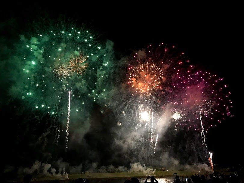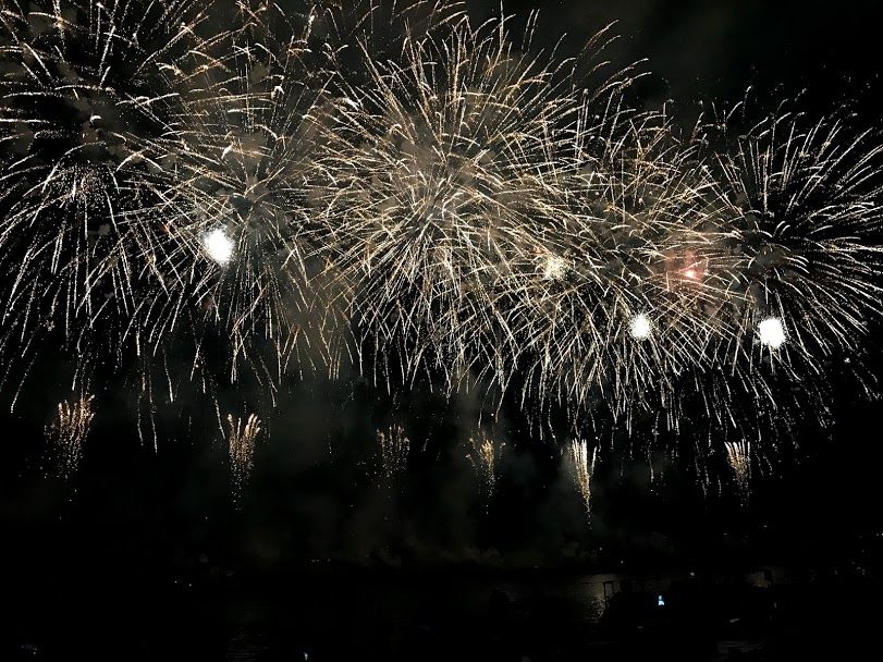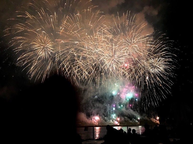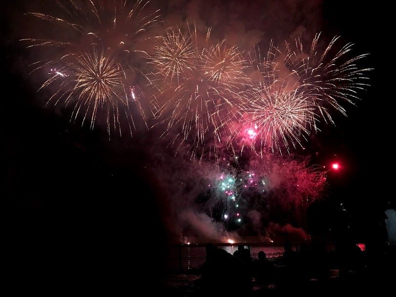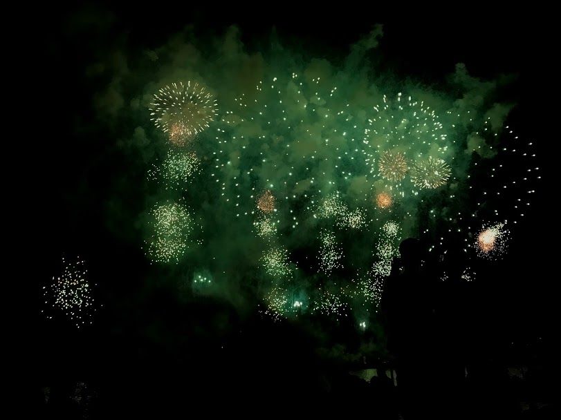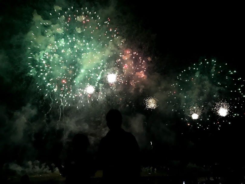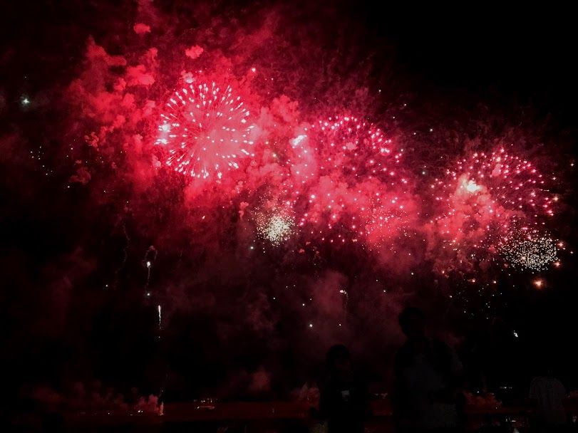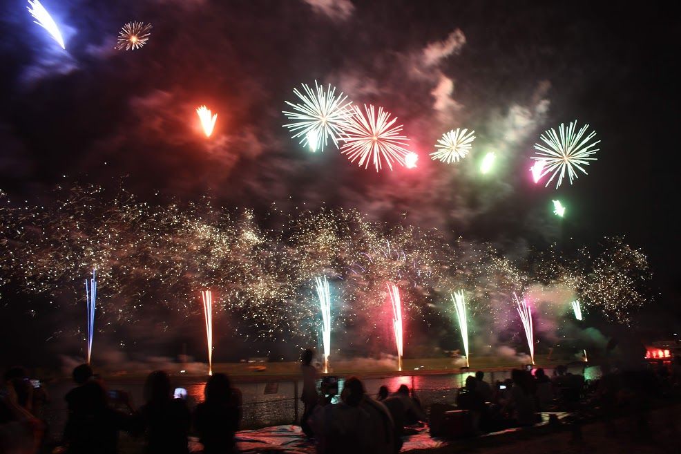 ดอกไม้ไฟจะไล่ระดับจากชุดเล็กไปใหญ่ หลังๆนี่เหมือนย้อมสีท้องฟ้าจากมืดเป็นไฟสปอตไลท์ พอเขาจุดเสร็จหนึ่งชุดก็เหมือนหนึ่งการแสดง ทุกคนก็จะปรบมือทุกครั้งที่จบการแสดง เราก็สนุกเพลิดเพลินกับเขาไปด้วย555555