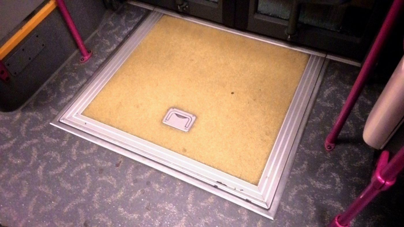 ผมมองไปทางด้านหน้ารถ เห็นพี่คนขับเปิดประตูลงจากที่นั่ง เขาเดินอ้อมมาตรงประตูด้านข้างรถ แล้วยกแผ่นรองที่ฝังตัวตรงพื้นทางออกขึ้น เขาเลื่อนมันออกมาชิดกับขอบฟุตบาท มันกลายเป็นทางเลื่อนลง ให้น้องผู้หญิงคนหนึ่งที่นั่งรถเข็นอยู่บนรถเมล์ เคลื่อนรถลงจากรถเมล์สู่ทางเท้าอย่างง่ายดาย จากนั้นแผ่นสไลท์ทางลงก็ถูกพับกลับเข้าที่เดิม(ผมถ่ายรูปทันช่วงนี้) คนขับรถเมล์ ก็เดินอ้อมตัวรถ เข้าสู่ที่นั่ง แล้วเคลื่อนรถออกไปตามปรกติ