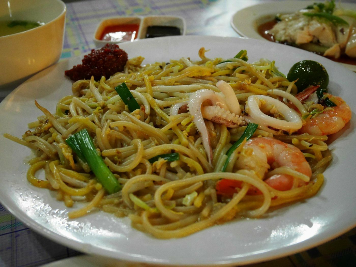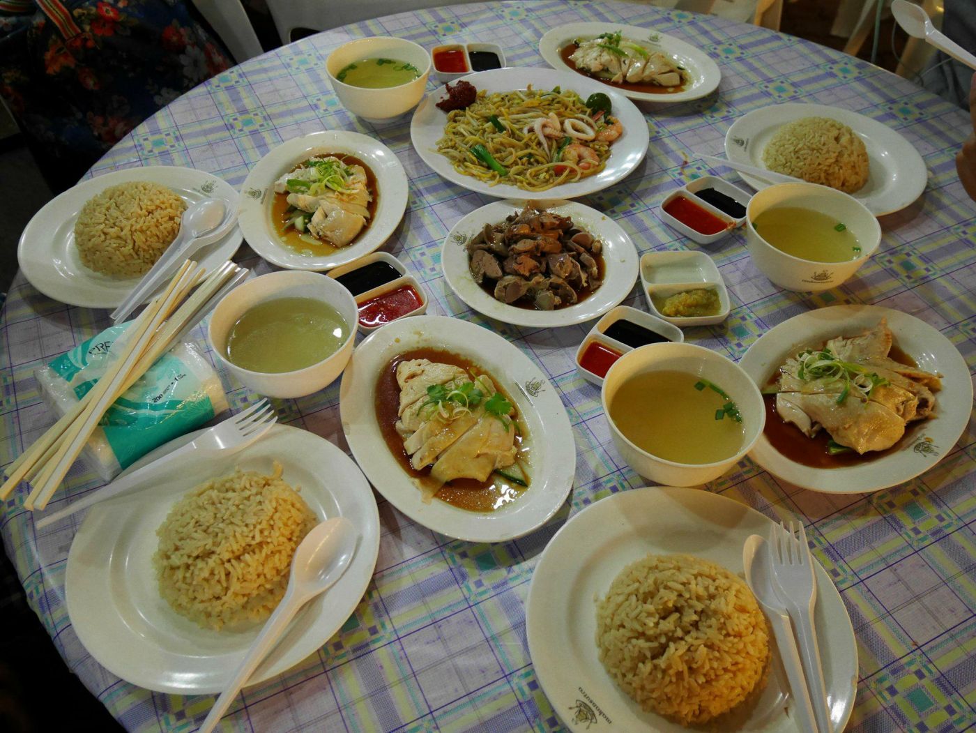 เวลาผ่านไปไม่นาน...ทุกคนก็ได้อาหารกลับมา รวมทั้งผม ที่ใช้สูตรเดิมๆว่า...หากคนมุงร้านไหน ร้านนั้นจะอร่อย(โดยเลี่ยงร้านที่ทัวร์จีนกำลังมุง) ผมซื้อข้าวมันไก่ แบบแยกข้าวมา 1 ชุด (ตามรูป ที่พนักงานเชียร์อาหารหน้าร้านแนะนำ)กับ ผัดเส้นหมี่สีเหลือง ซึ่งเดาว่าคงเป็น ผัดหมี่ฮกเกี้ยน