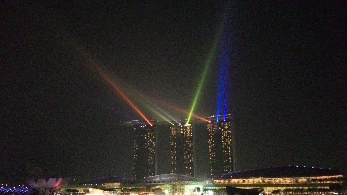 “ แต่น.นนนนน...แต้น.นนนนน!!!” พร้อมๆกับเสียงปรบมือของผู้คนแถวนั้น เมื่อหันไปทางอ่าวต้นเสียง ก็พบกับการแสดง แสงสี เสียง ที่มาจากตึกเรือ( Wonder Full-Light & Water - Marina Bay Sands) ผมร้อง เฮ้ย!!! พร้อมกับปลุกน้องๆ ขึ้นมาดู