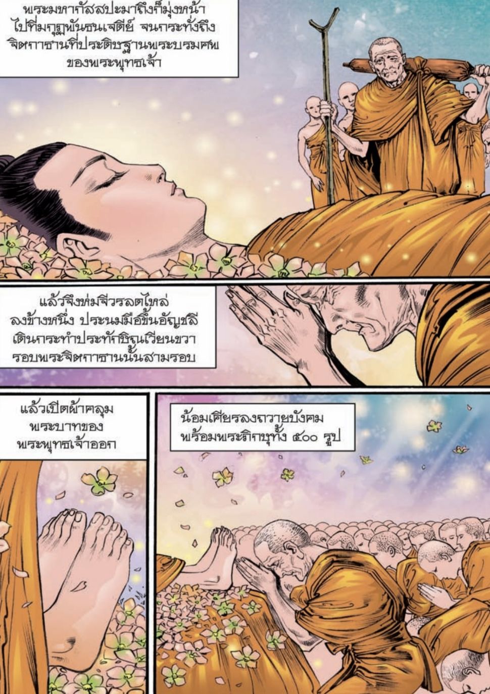 หลังจากนั้น ผ่านไปนาน จนพระมหากัสสปะเห็นชีเปลือยถือดอกมณฑาสวรรค์มา และได้รู้ว่า พระพุทธเจ้าปรินิพพานแล้ว ดังนั้น ท่านรีบเดินทางไปกราบพระพุทธเจ้า แต่ระหว่างเดินทาง พบว่า พระรูปหนึ่งบอกว่า ดีใจที่ไม่คนมาจู้จี้จุกจิกอีกแล้ว ทำให้ท่านคิดว่า อีกไม่นาน ศาสนาจะเสื่อมเพราะคนเหล่านี้