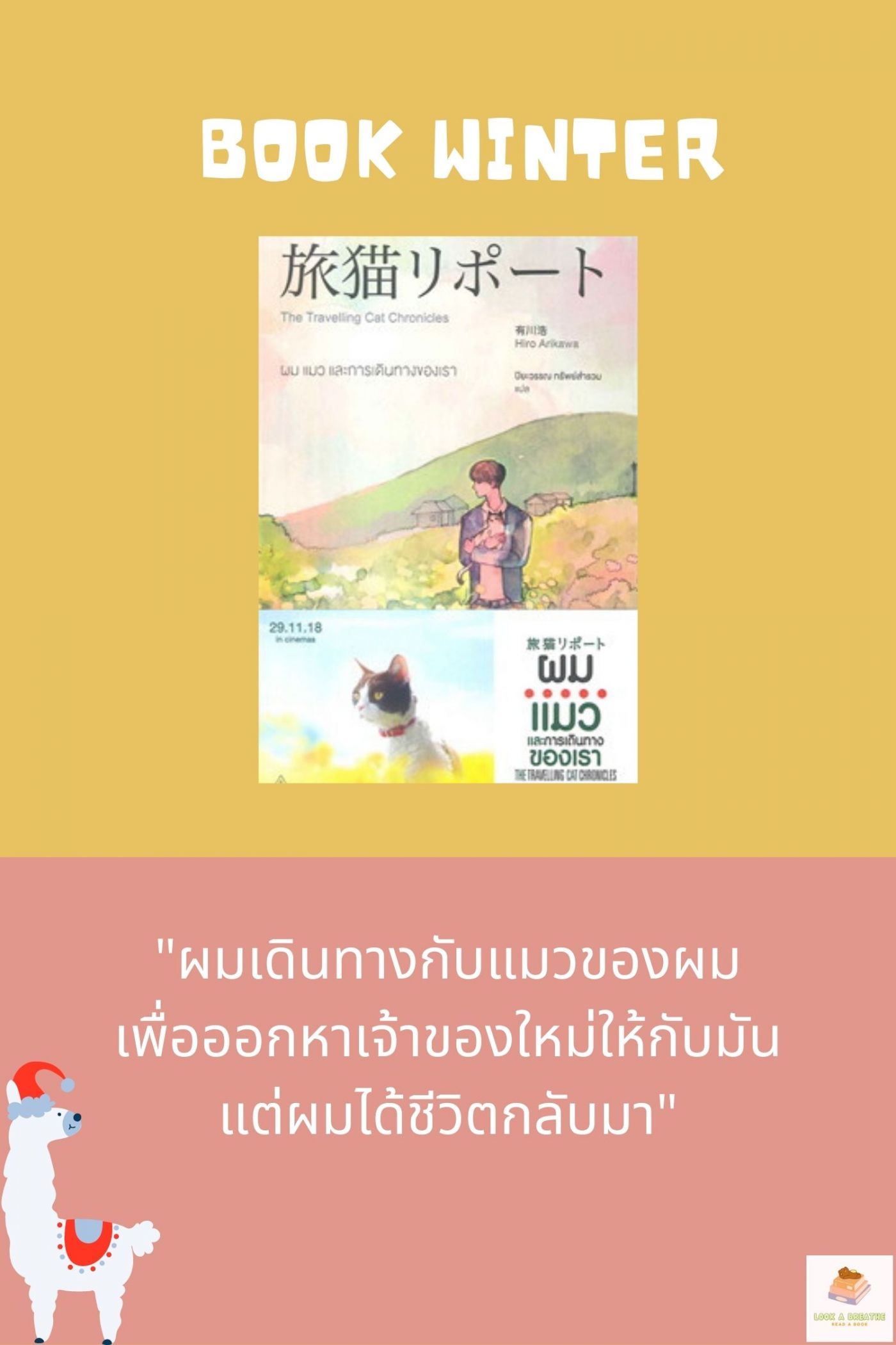 16.) ผม แมวและการเดินทางของเรา เป็นเรื่องราวของการเดินทางทางตามหาเจ้าของใหม่ให้กับแมว พร้อมกับตามหาความหมายของชีวิต
