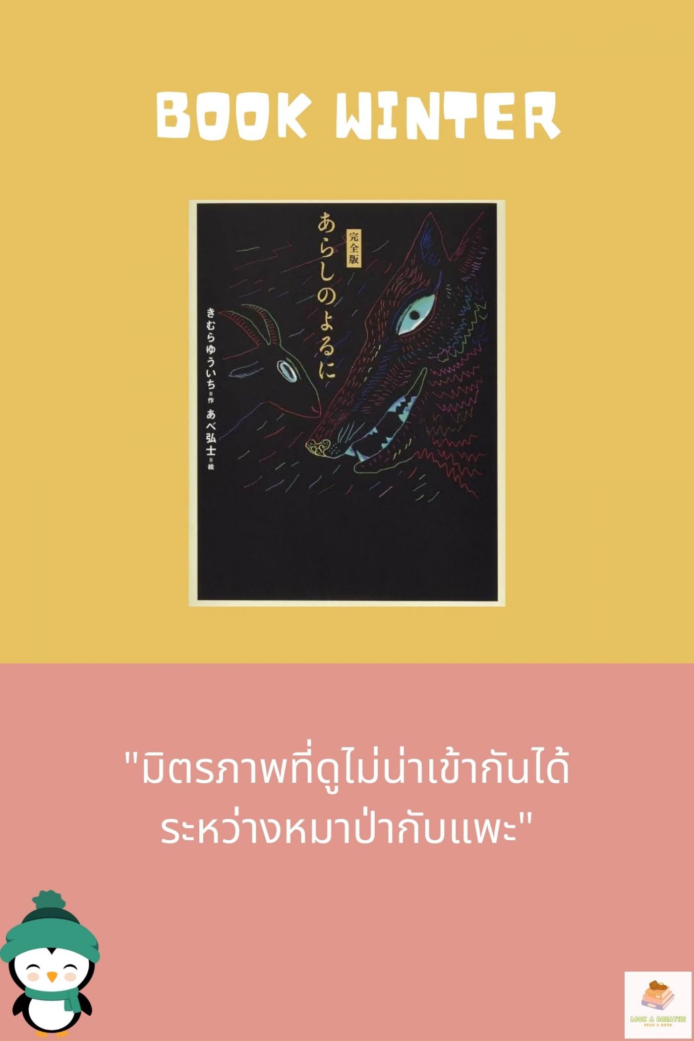 หมายเหตุ หนังสือเล่มหนึ่งที่รีวิว คือ あらしのよるに (ในคืนพายุกระหน่ำ) ที่พูดถึงมิตรภาพระหว่างหมาป่ากับแพะที่เจอกันในคืนพายุกระหน่ำ