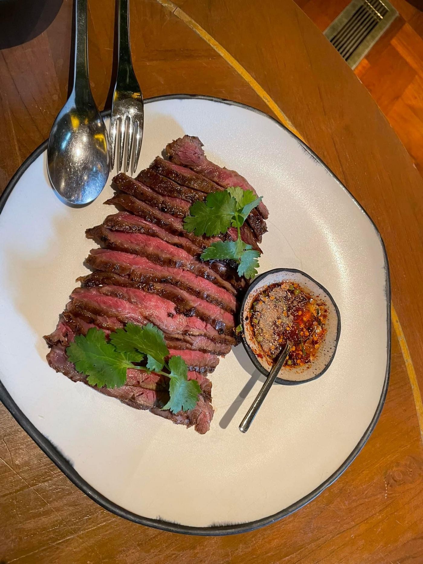 ๔.เนื้อย่างเสือร้องไห้ เป็นเนื้อที่มีเดียวแรร์ (Medium Rare) แต่สดและรสชาติเผ็ดๆ
