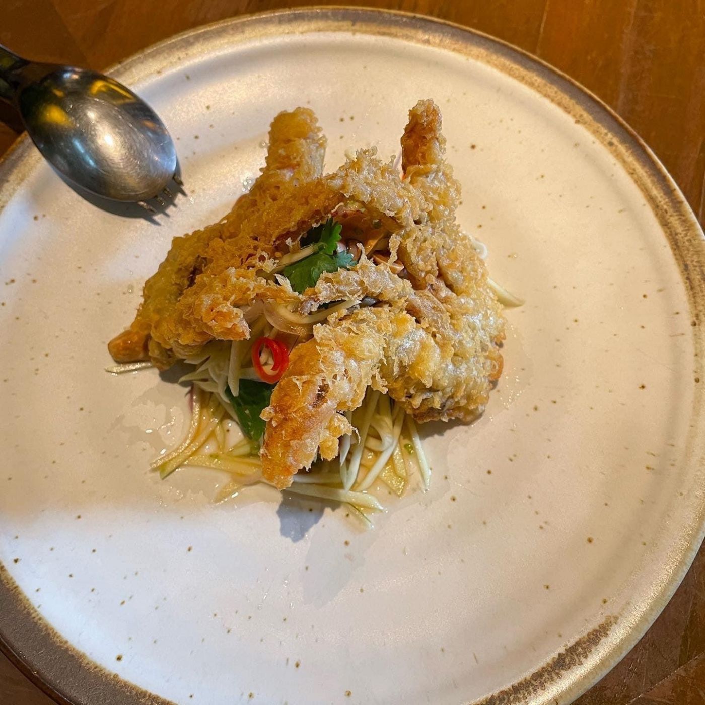 ๑.ยำมะม่วงปูนิ่มทอด ที่ทานปูได้ทั้งตัวและรสชาติออกเปรี้ยวๆเค็มๆ