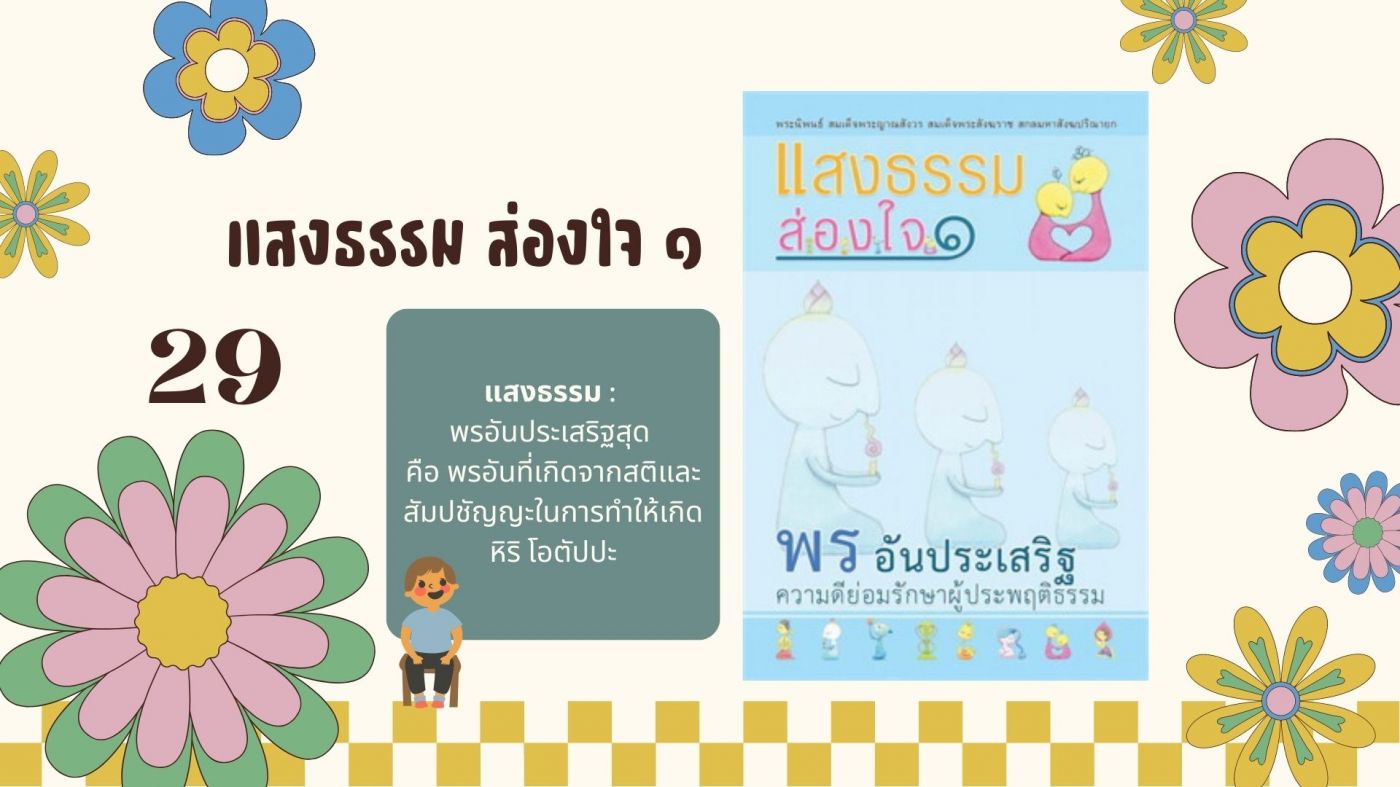 หนังสือเล่มนี้ เริ่มต้นด้วยความดีย่อมรักษาผู้ประพฤติธรรม และหนังสือเล่มนี้เป็นคำพูดสั้นๆที่ได้ใจความ แถมเมื่อเราอ่าน เราจะพบว่า พรอันประเสริฐอยู่ใกล้ๆตัวเรานี่เอง และหลักๆของเล่มนี้ แบ่งออกเป็นทั้งหมด ๘ ประการ ได้แก่