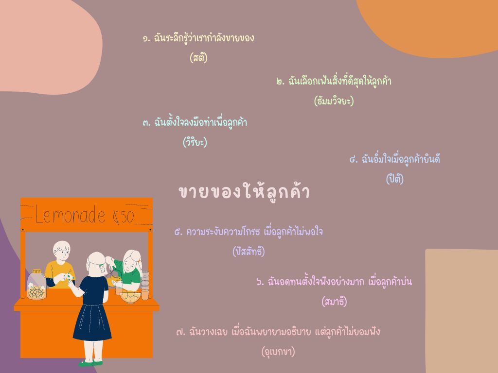 ๗. สัมมาสติ แปลว่า สติ คือ ระลึกชอบ และสัมปชัญญะ คือ รู้สึกตัวชอบ