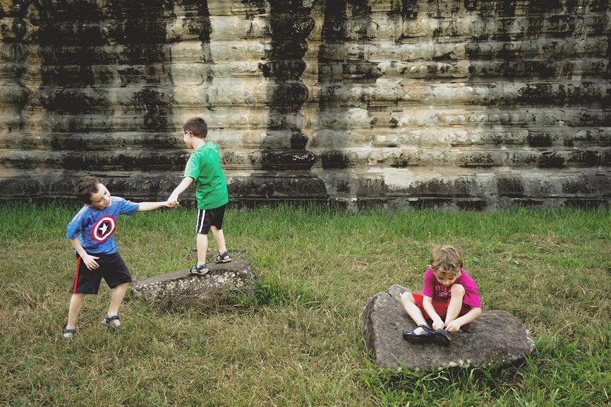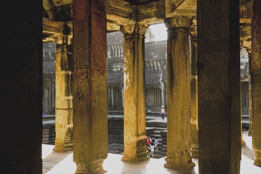 แต่สำหรับตัวผมเอง กลับชอบบรรยากาศของลานสนามหญ้าใหญ่ ที่คั่นระหว่างตัวเขตปราสาทหลักกับระเบียงคดด้านท้ายมากเอาเป็นพิเศษ อาจเป็นเพราะอากาศที่ไม่ร้อนมากในช่วงเวลาบ่ายแก่ ร่วมกับเสียงหัวเราะเอิ้กอ้ากชุดใหญ่ของหนูน้อยนักท่องเที่ยวตัวจิ๋ว ที่กำลังวิ่งไล่จับกันอย่างสุดฝีเท้า ทำให้ลานหญ้าว่างเปล่าในสายตาผู้ใหญ่อย่างเราๆ แปลงเป็นสนามเด็กเล่นส่วนตัวสุด exclusive ของเด็กๆทั้ง 3 คนไปโดยปริยาย กลายเป็นอีกภาพน่ารักๆในนครวัดที่ประทับอยู่ในความทรงจำอันดับต้นๆที่ผมมีต่อที่นี่เลยแหละครับ