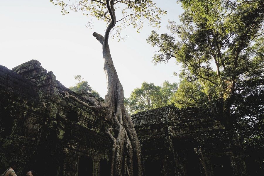 ต้นสะปงขนาดใหญ่ที่งอกและโตพันคร่อมทับหลังคาในตัวปราสาทตาพรม คือภาพที่ท่องเที่ยวทุกคนล้วนต้องหยุดเพื่อยกกล้องขึ้นมาถ่ายรูปคู่ด้วย ตาพรมคือหนึ่งในปราสาทในยุคหลังๆของเขมรที่สร้างขึ้นเป็นพุทธบูชา หลังจากที่เขมรเปลี่ยนมานับถือพุทธศาสนาแล้ว มอสที่เขียวอ่อนและบรรยากาศที่ร่มครึ้มตัดสลับหินสีแดงทรายและขาวดำ ลวงให้เราเพลินจนสามารถเดินชมความงามจากรูปสลักและสถาปัตยกรรมเขมรยุคหลังได้อย่างลืมเวลาไปเลย