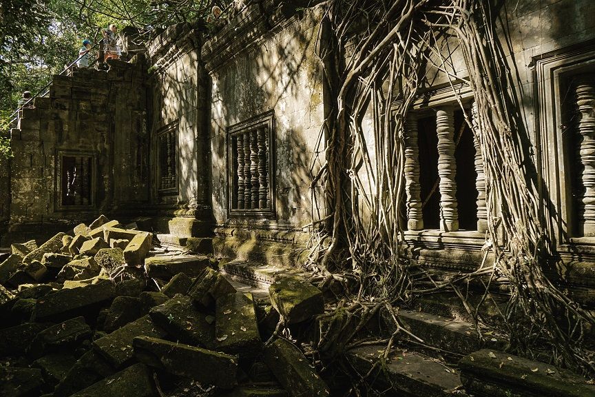 หากถามว่าปราสาทใดในทริปนี้ที่มี Gimmick มากที่สุดคงต้องยกให้เบ็งเมเลียครับ เบ็งเมเลียคือปราสาทที่ซ่อนตัวอยู่ในพงไพรอย่างแท้จริง การไปชมต้องนั่งรถออกจากตัวเสียมเรียบไปกว่า 60 กม. เบ็งเมเลียเต็มไปด้วยกองซากหินปรักหักพังที่ถูกระเบิดในสมัยสงครามกลางเมืองยุคเขมรแดง แต่ซากหินที่ถล่มลงมานี่แหละครับคือจุดขายสำคัญของที่นี่ เราเดินผ่านกองหินที่ถูกปกคลุมไปด้วยมอสสีเขียวโพลนตานับไม่ถ้วน รากไม้และเถาวัลย์ที่ยืดยาวระย้าทาบทับบนผนังปราสาท ประกอบกับไอชึ้นและร่มไม้จากป่าด้านรอบ ชวนให้ผมอดนึกถึงจินตนาการการผจญภัยชวนฝันสมัยเด็กๆไม่ได้เชียวแหละครับ