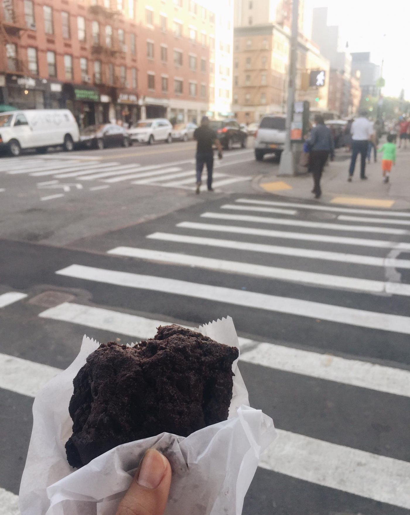 ยังไม่พอ นอกจากจะไม่รีบแล้ว ยังอุตส่าห์เดินกลับให้ผ่านทางที่มีร้านคุกกี้ด้วย 5555 (นอกเรื่อง ร้านนี้ดังมาก ชื่อร้าน Levain Bakery ปกติถ้าเป็นสาขาอื่นแถวจะยาวมาก ยาวออกมานอกร้านตลอดเลย แต่วันนั้นที่ไปสาขาในฮาร์เล็มไม่มีลูกค้าเลยอะ หรือเพราะมันเย็นแล้วก็ไม่รู้ เลยได้โอกาสดี ได้ลองกินคุกกี้ของร้านนี้เป็นครั้งแรกหลังจากได้ยินชื่อเสียงมานาน 5555) ทางนั้นร้างมาก มองไปข้างหน้าเห็นบอยแบนด์พี่ ๆ คนดำนั่งอยู่บนบันไดอพาร์ตเมนต์ไกล ๆ เค้าไม่ได้อะไรยังไงกับเราหรอก เค้าอาจจะแค่ออกมานั่งคุยกันคูล ๆ แต่โดยสัญชาตญาณมีเสียงในหัวบอกว่าเดินไปอีกทางมั้ย และตอนนั้นไม่มีใครเลยนอกจากพี่ ๆ กลุ่มนั้น เพื่อความปลอดภัยหรือความอะไรไม่รู้ เราเลยเดินกลับไปแล้วไปเดินอีกทาง