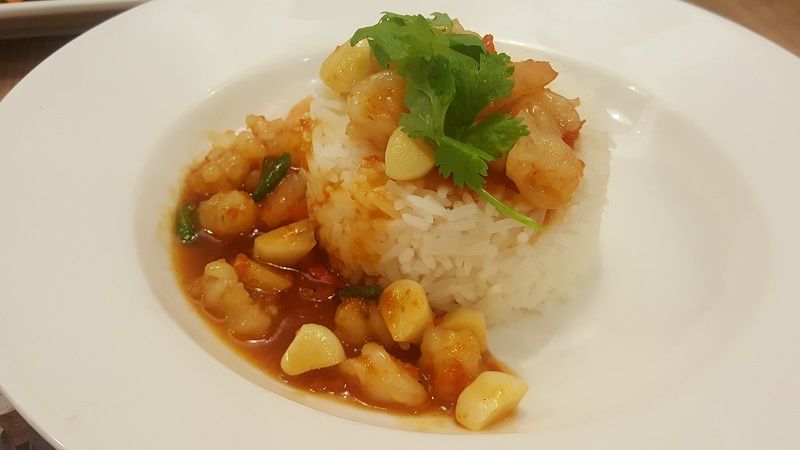 จานนี้ของโลมาเองจ้า โลมาชอบที่รสชาติไม่เผ็ดเกินไป เนื้อกุ้งหั่นชิ้นใหญ่ กระเทียมชิ้นโต ๆ กินกรุบ ๆ ข้าวนิ่ม ๆ กินแล้วฟิน แต่แอบเค็มไปสักนิด และถ้ามีผักสลัด หรือแตงกวา มะเขือเทศด้วยก็จะดีมากเลยจ้า หุ หุ ???