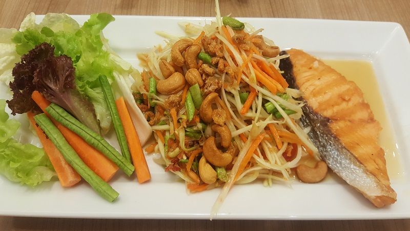 ปลาแซลมอนแอบไปอยู่เคียงคู่ส้มตำ ปลาแซลมอนเนื้อแห้งไปสักนิด ส้มตำรสชาติโดยรวมก็โออยู่ โลมาชอบที่มีผักสลัด ส้มตำจานนี้ไม่มีถั่วลิสง แต่มีเม็ดมะม่วงหิมพานต์กินกรอบ ๆ อร่อยดี กุ้งแห้งถึงจะชิ้น ๆ เล็ก (ดูไม่ค่อยเป็นตัวนะ 55) แต่ก็กรอบอร่อยเหมือนกันจ้า
