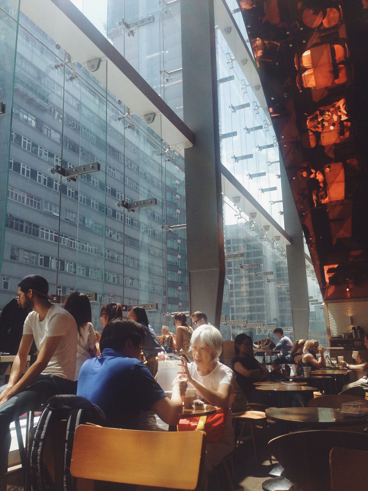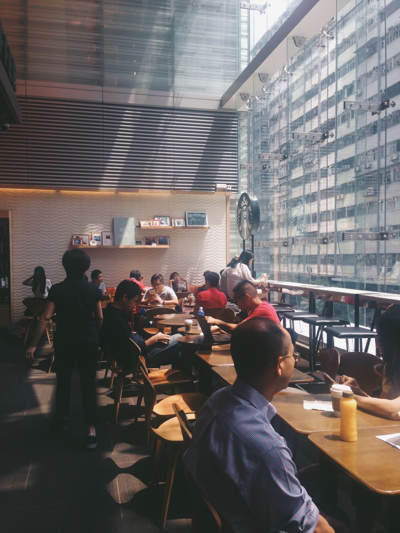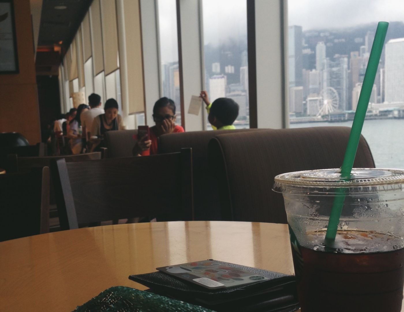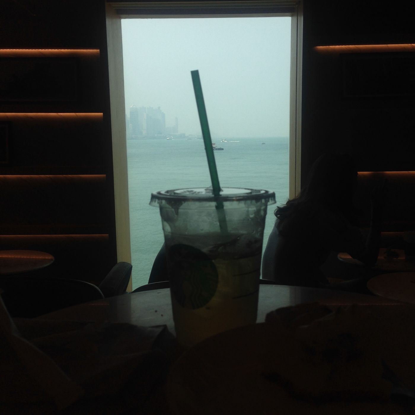 พื้นที่ด้านหลังเคาน์เตอร์ชงกาแฟเป็นแนวยาว โต๊ะทุกตัวอยู่ติดกระจกใสบานใหญ่ วิวที่เห็นด้านหน้าเป็นอ่าววิคทอเรีย (Victoria Harbor) กับตึกสูงฝั่งฮ่องกง มองเห็น Hong Kong observation wheel หรือชิงช้าสวรรค์ของฮ่องกง วิวถูกจริตเป็นอย่างยิ่ง บางครั้งกาแฟจะอร่อยก็เพราะว่าวิวสวยเทพแบบนี้นี่แหละ ฉันเป็นคนกลาง ๆ ไม่ธรรมชาติจ๋าหรือหลงแสงสีจัด เข้าป่าได้พอๆกับเข้าห้าง ชมวิวตึกสูงได้พอ ๆ กับชมวิวดอย จะว่าไม่มีจุดยืนก็ได้อีกเหมือนกัน ก็เดินไปได้ทุกที่ ทำไมต้องยืน