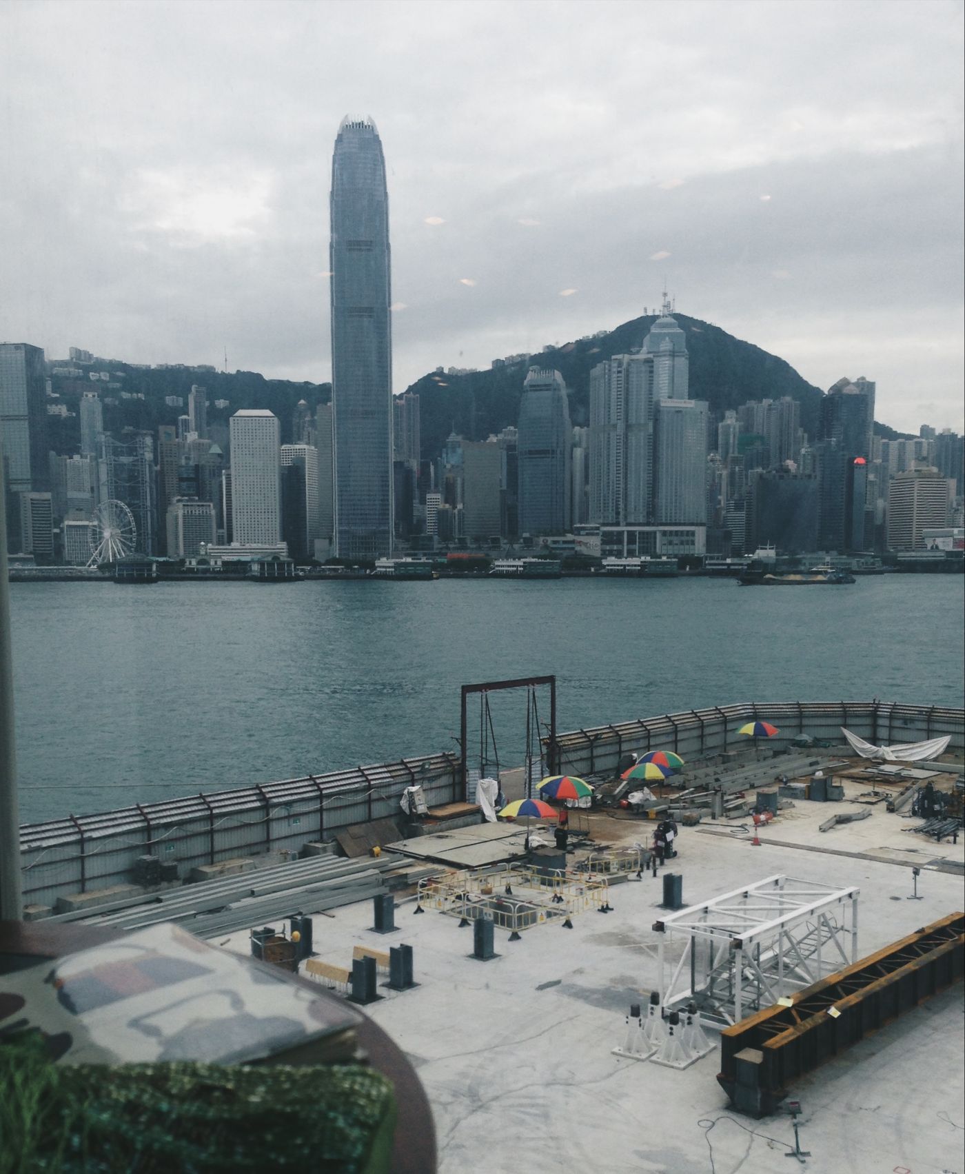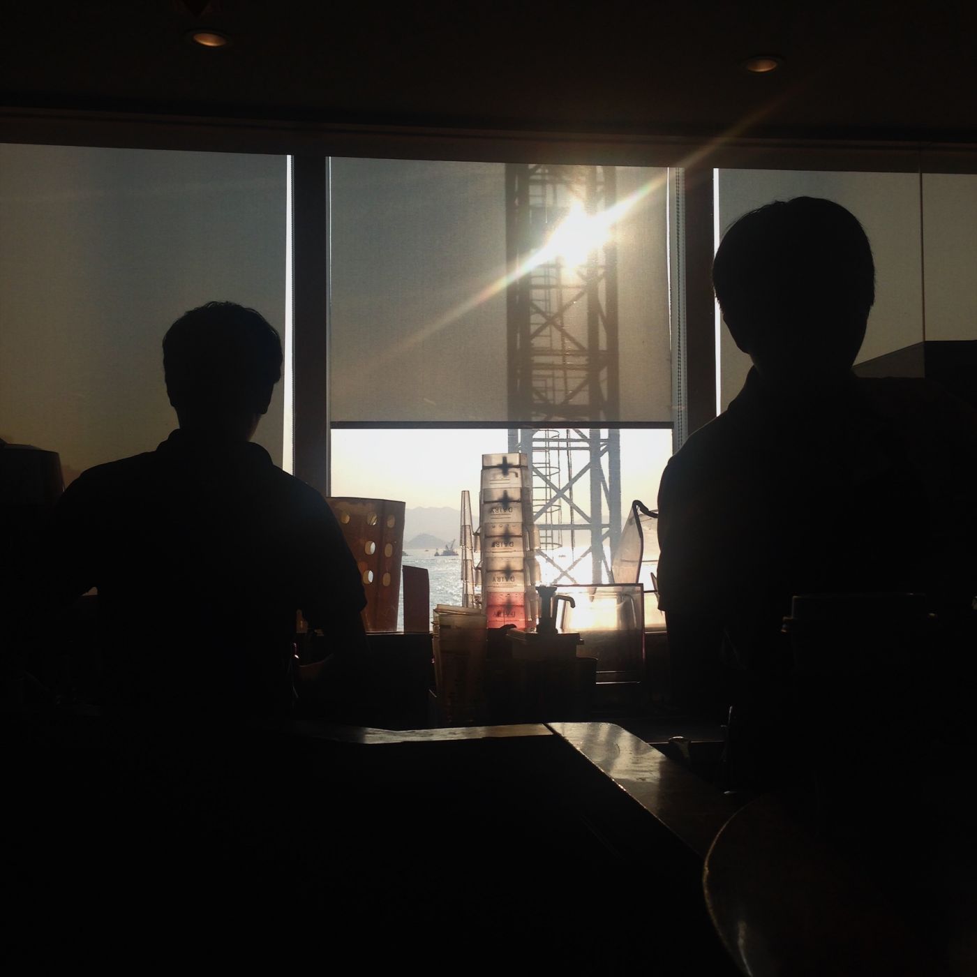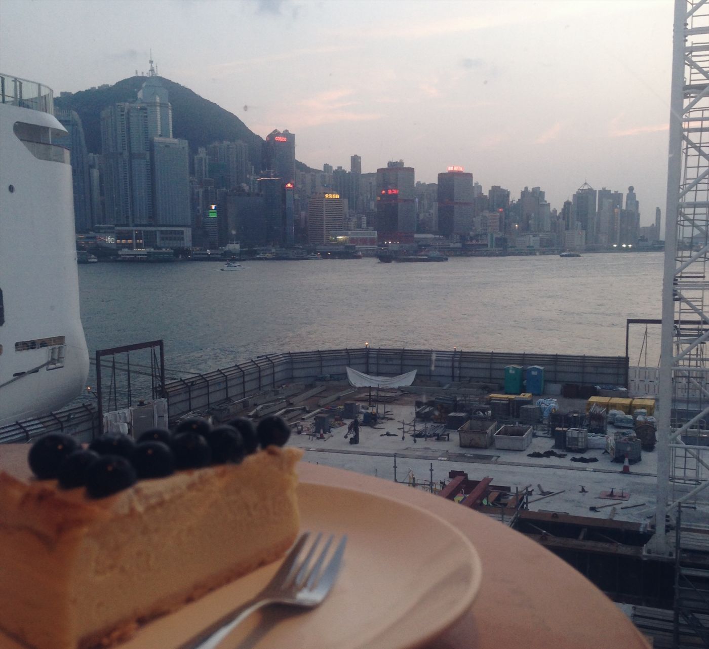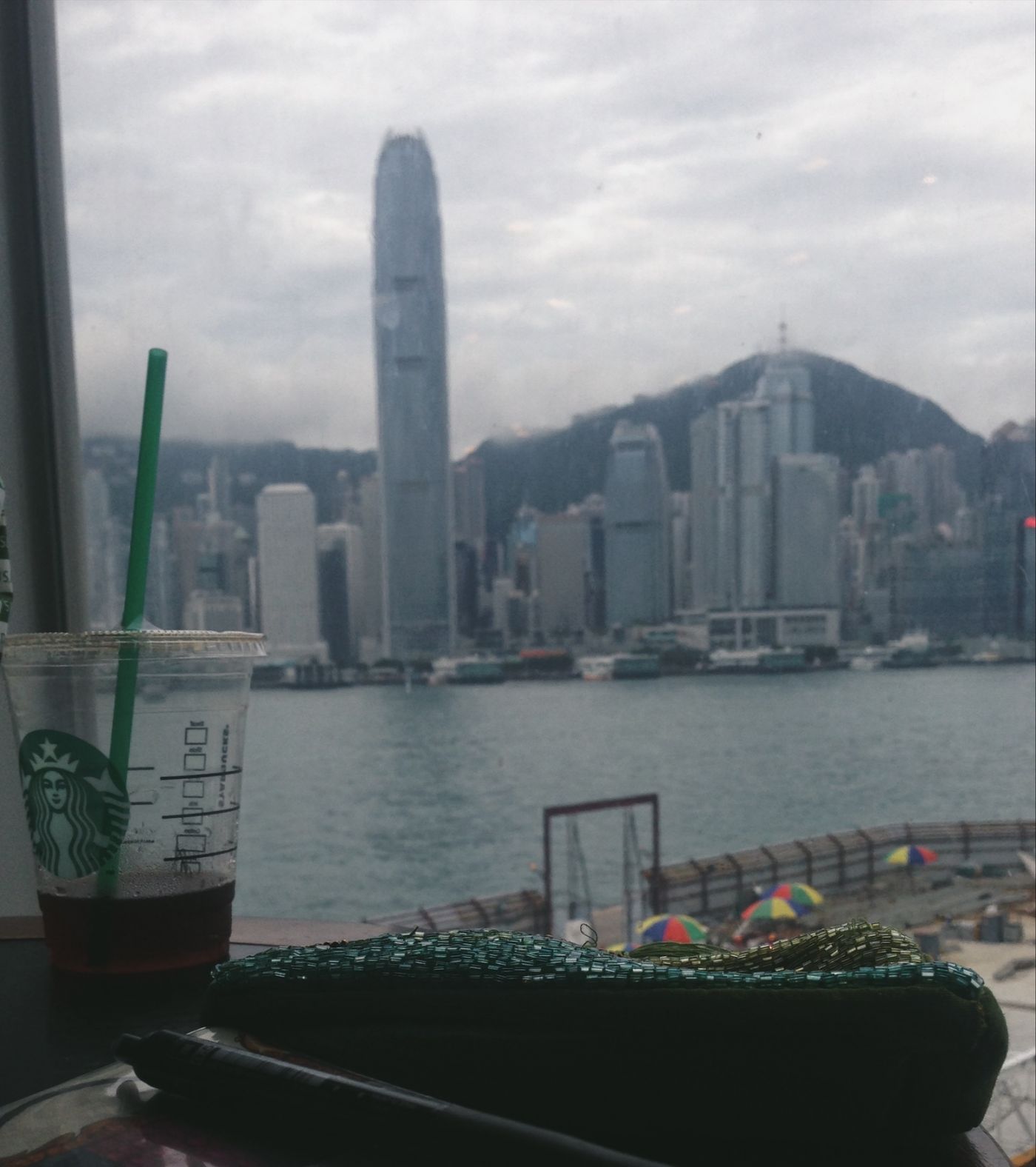 พื้นที่ด้านหลังเคาน์เตอร์ชงกาแฟเป็นแนวยาว โต๊ะทุกตัวอยู่ติดกระจกใสบานใหญ่ วิวที่เห็นด้านหน้าเป็นอ่าววิคทอเรีย (Victoria Harbor) กับตึกสูงฝั่งฮ่องกง มองเห็น Hong Kong observation wheel หรือชิงช้าสวรรค์ของฮ่องกง วิวถูกจริตเป็นอย่างยิ่ง บางครั้งกาแฟจะอร่อยก็เพราะว่าวิวสวยเทพแบบนี้นี่แหละ ฉันเป็นคนกลาง ๆ ไม่ธรรมชาติจ๋าหรือหลงแสงสีจัด เข้าป่าได้พอๆกับเข้าห้าง ชมวิวตึกสูงได้พอ ๆ กับชมวิวดอย จะว่าไม่มีจุดยืนก็ได้อีกเหมือนกัน ก็เดินไปได้ทุกที่ ทำไมต้องยืน