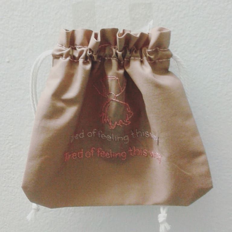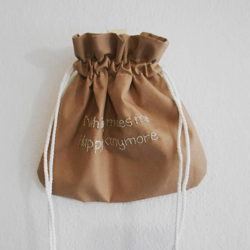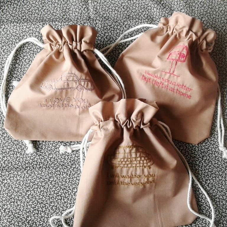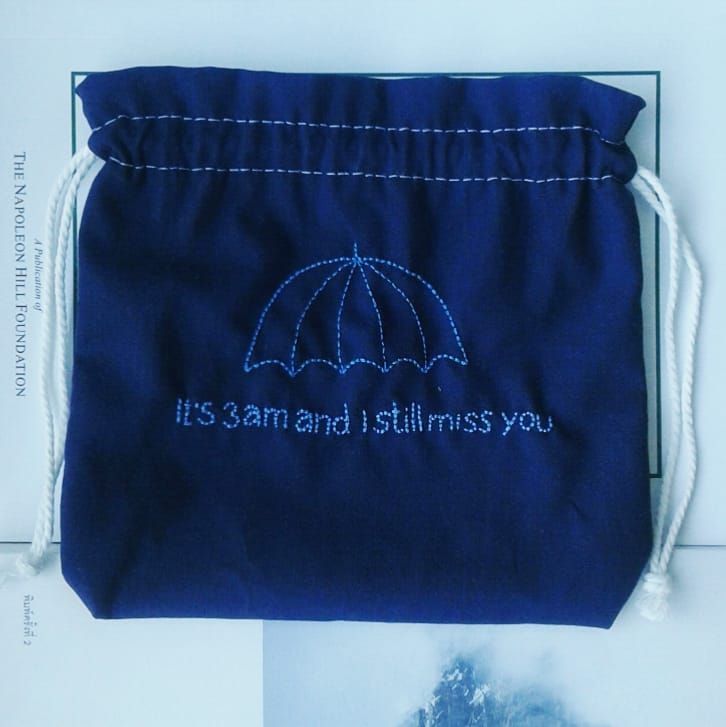 และสำคัญคือใส่ฟังก์ชั่นให้ผ้าที่ปัก ด้วยการทำเป็นกระเป๋าผ้าใบเล็กๆ ใส่เชือกรูดทั้ง 2 ข้าง