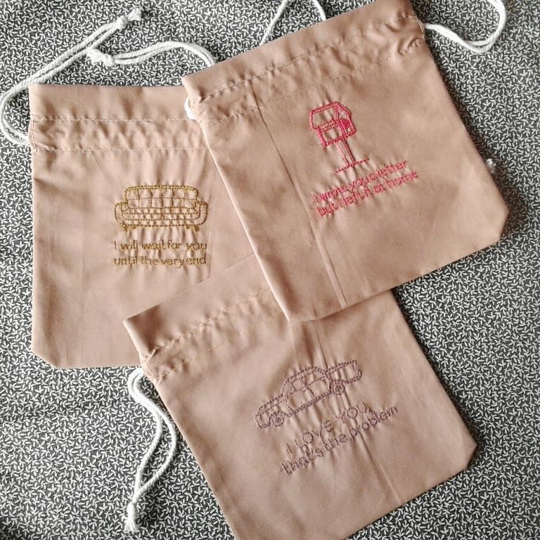 ตั้งแต่การปักลวดลาย ปักข้อความ และเย็บประกอบกระเป๋า ตามภาพเลยค่ะ นำมาบางส่วน