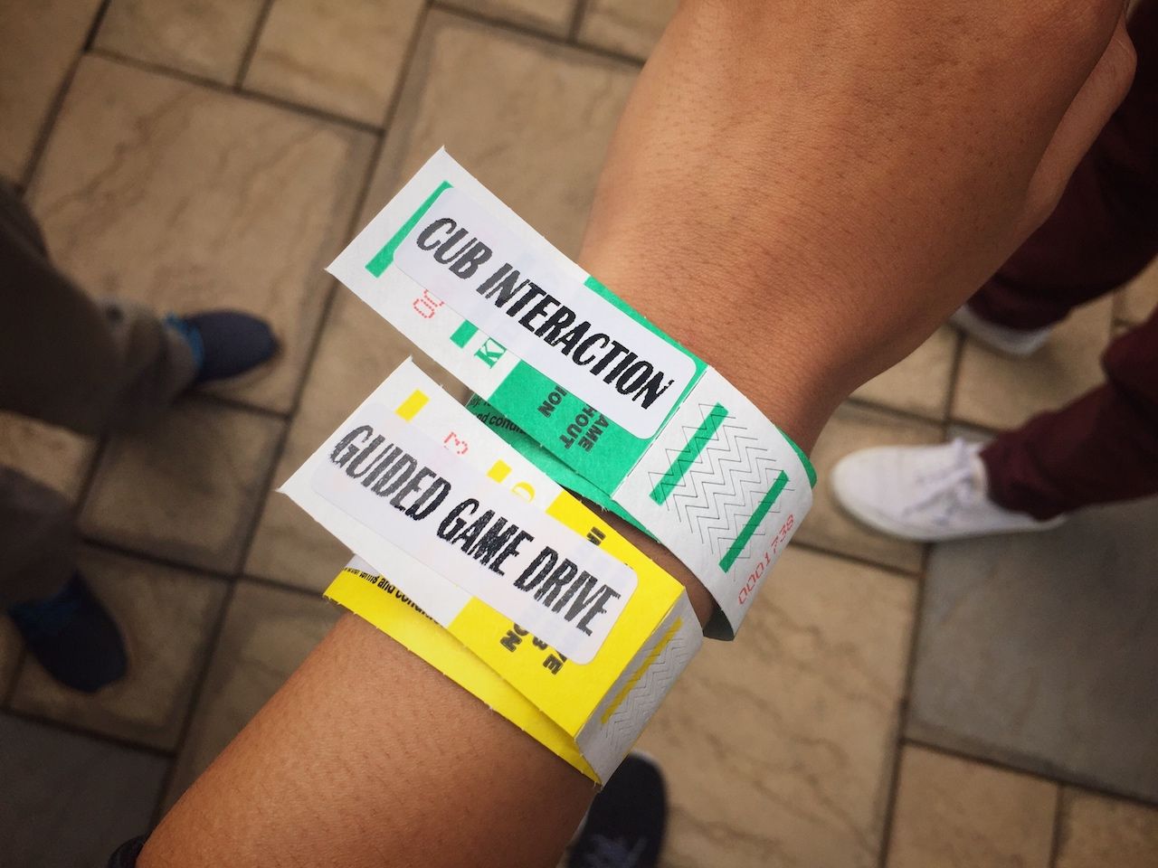 เรานั่งรถออกมาไกลพอให้งีบหลับได้ในรถ ไปถึงปุ๊บเราก็ได้รับที่รัดข้อมือมาสองกัน สีเขียวคือเราจะได้ไปเซย์ฮายทักทายลูกสิงโต ส่วนอันสีเหลืองนั้นคือบัตรที่จะไปนั่งรถซาฟารีเที่ยวชมในสวน