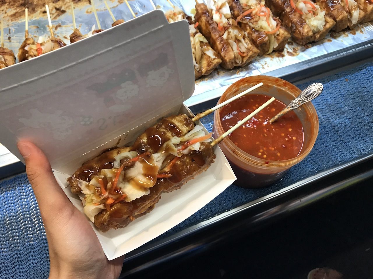 เนื้อเต้าหู้แน่นดี ตรงกลางเป็นผักๆ ราดซอสเค็มๆ ถ้าชอบเผ็ดๆก็เติมน้ำจิ้มพริกได้ อร่อยดีเปรี้ยวๆ