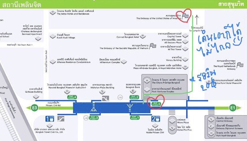 โอเคค่ะ มาถึงขั้นตอนต่อไปคือการสัมภาษณ์วีซ่า เราจะแนะนำการเดินทางให้สำหรับคนที่ไม่เคยไปสถานฑูตแบบเรานะคะ ของเราเริ่มต้นจาก BTS เลยค่ะ ลงสถานีเพลินจิตนะคะ แล้วออกทางออกที่ 5 โรงแรมดิโอกุระค่ะ สำหรับเรางงมากตอนเดินตามเข้าไป คือมันเป็นทางเชื่อมเข้าโรงแรมค่ะ สรุปคือเดินเข้าไปตึกได้เลย แล้วมันจะพาออกมาอีกทาง เป็นฝั่งตามในรูปนะคะ (เราเข้าออกทางนี้อย่างเดียว เลยไม่แน่ใจว่ามันเดินออกทางไหนได้อีก เราตามกระทู้พันทิปเลยค่ะ ฮ่าๆ) ส่วนเส้นทางการเดินก็ตามในภาพเส้นสีเขียวเลยนะคะ เราไม่รู้ว่ามันใกล้หรือไกลในตอนนั้น เลยเสียค่าวิน 20 บาท แต่จริงๆถ้าไม่รีบก็เดินดีกว่าค่ะ แถวนั้นร่มรื่น เดินได้สบายเลย ใช้เวลาประมาณ 10 นาทีในการเดินเท่านั้นค่ะ