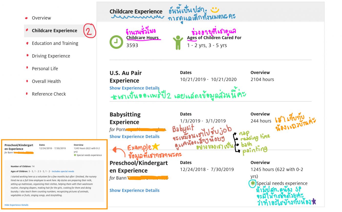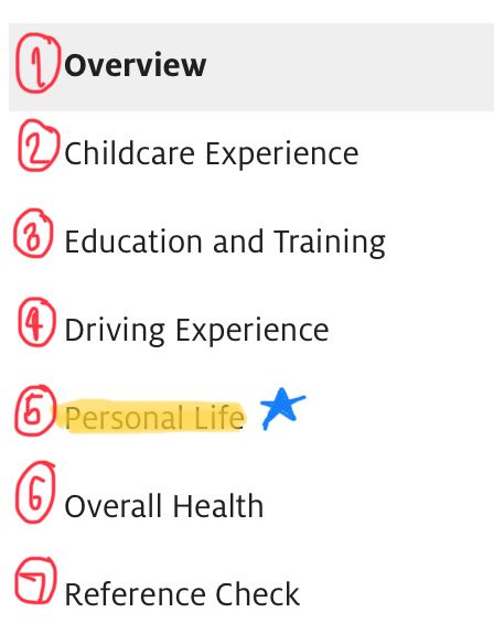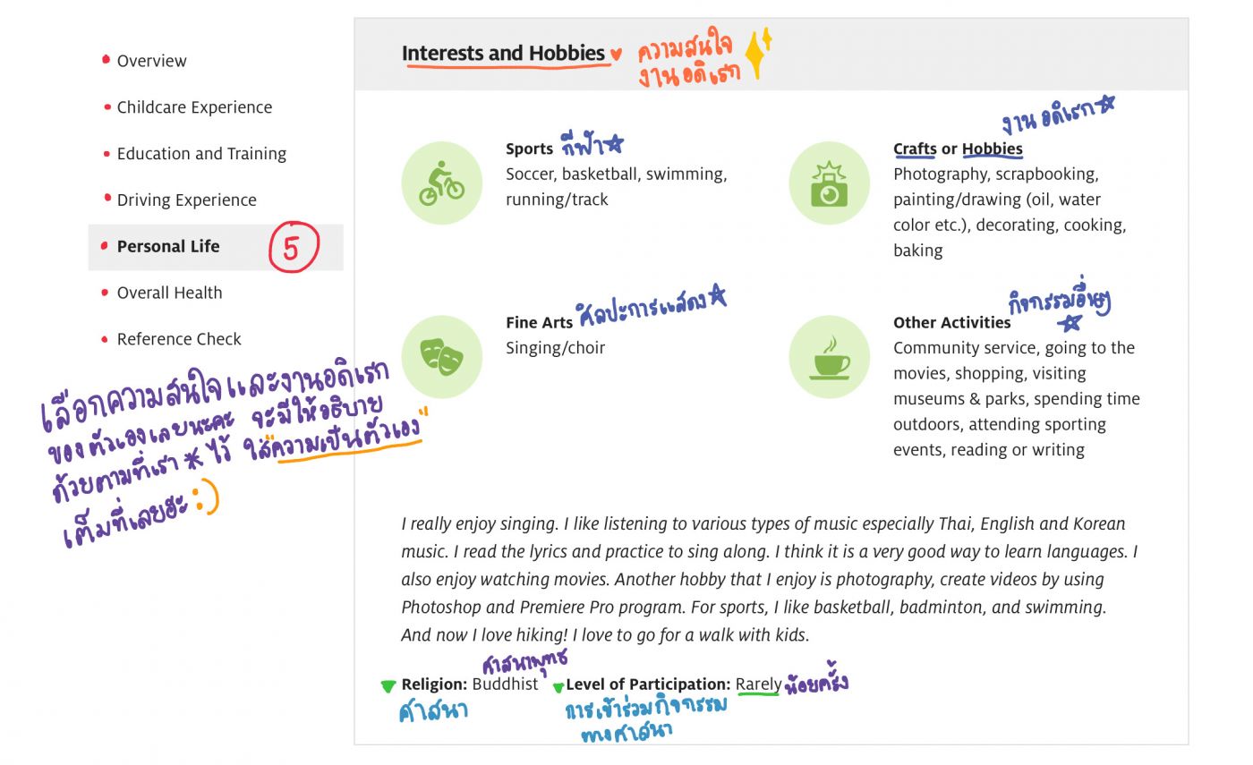 - ส่วนหัวข้อที่ 5 จะเป็น Personal Life นะคะ ซึ่งประกอบไปด้วยข้อมูลเกี่ยวกับครอบครัว ความสนใจและงานอดิเรก และการตอบคำถามเกี่ยวกับออแพร์ค่ะ ซึ่งจะแสดงทัศนคติของเรา รวมถึงการ discipline เด็ก ว่าเราจะดูแลน้องไปในทางไหน เราขออนุญาตไม่เปิดเผยข้อมูลเกี่ยวกับครอบครัวและการตอบคำถามของเรานะคะ แต่ถ้าหากใครอยากได้ไกด์ในการตอบคำถาม ยินดีช่วยเหลือด้วยการหลังไมค์มาถามทางทวิตเตอร์เช่นเดิมค่ะ หน้าตาของหัวข้อนี้เป็นไปตามภาพด้านล่างนี้เลยนะคะ