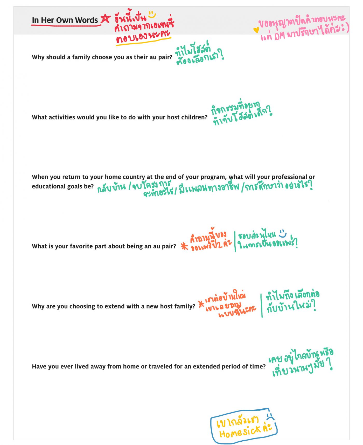 ส่วนคำถามเกี่ยวกับออแพร์ที่ต้องตอบก็มีตามด้านล่างนี้เลยค่ะ การตอบคำถามเป็นส่วนที่สำคัญมากๆ โฮสต์จะรู้จักตัวตน รวมถึงข้อมูลของเราจากตรงนี้เลยค่ะ ว่าเรามีอุปนิสัยอย่างไร ต้องการงานแบบไหน จบออแพร์แล้วจะทำอะไรต่อ ฉะนั้นต้องคิดคำตอบกันดีๆนะคะ