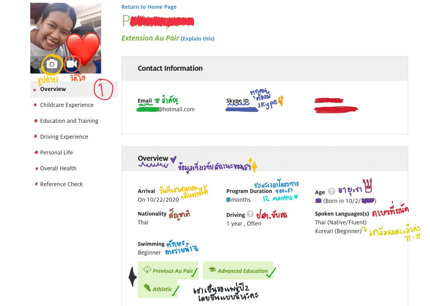 ก่อนอื่นต้องขออภัยสำหรับลายมือเราด้วยนะคะ ฮ่าๆ เนื่องจากเราเป็นออแพร์ปี 2 มันเลยจะแตกต่างจากเพื่อนๆหลายคนที่เพิ่งจะเริ่มออนไลน์ปีแรกนิดนึงนะคะ แต่หลายๆส่วนก็คงเดิมค่ะ แค่เพิ่มสถานะเป็น Extension Au Pair และแสดงข้อมูลบางส่วนที่ปีแรกจะไม่มี อย่างในกรอบสีเขียวตามภาพค่ะ ในส่วนของหัวข้อนี้ไม่มีอะไรมากค่ะ เราจะได้กรอกช่องทางการติดต่อและอัปโหลดรูปโปรไฟล์เท่านั้น นอกนั้นจะเป็นข้อมูลสรุปจากที่เรากรอกในหัวข้ออื่นๆมาแสดงผลในหัวข้อนี้ เพื่อให้โฮสต์เห็นภาพรวมค่ะ
