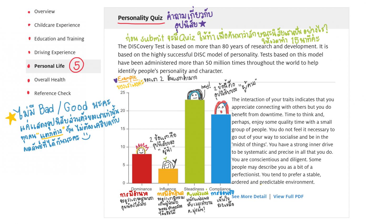 3) Personality Quiz : มาถึงหัวข้อหลักสุดท้ายที่เราจะพูดถึงในอีพีนี้กันแล้วนะคะ อันนี้จะมีให้ทำก่อนที่ทุกคนจะกด submit โปรไฟล์นะคะ เราไม่สามารถแสดงคำถามให้ทุกคนดูได้ เพราะเราทำตั้งแต่ปีแรกแล้ว และไม่ได้บันทึกไว้ว่าหน้าตามันเป็นยังไง เท่าที่จำได้คือมีคำถามประมาณ 30 ข้อค่ะ ให้ทำให้เสร็จภายในเวลา 15 นาที และกด submit แล้วมันก็จะแสดงผลให้เราอีกทีที่หน้าโปรไฟล์ ซึ่งในข้อนี้ต้องบอกเลยว่าอย่ากังวลนะคะ มันไม่มีถูกผิดหรือดีร้ายอย่างไร มันเป็นข้อมูลที่แสดงอุปนิสัยส่วนตัวของเราเท่านั้น สำหรับเราในตอนนั้น คำถามไม่ยากเกินไป แต่ด้วยความที่เราไม่เก่งภาษา และต้องตอบคำถามในเวลาที่กำหนดอีก ฉะนั้นจึงแนะนำเพื่อนๆเปิดหน้าเครื่องมือแปลภาษาไว้อีกหน้าต่างหนึ่งเลยค่ะ เพื่อเป็นใช้เป็นเครื่องทุ่นแรงนะคะ เอาล่ะ มาพูดเรื่องผลลัพธ์กันบ้าง เราจะแชร์ผลลัพธ์ของเราให้เพื่อนๆดูแล้วกันนะคะ มีใครสงสัยมั้ยว่าอุปนิสัยส่วนตัวของเราเป็นอย่างไร ถ้าสงสัยล่ะก็มาดูไปพร้อมกันเลยนะคะ ผลลัพธ์ของเราก็เป็นดังภาพด้านล่างนี้ค่ะ